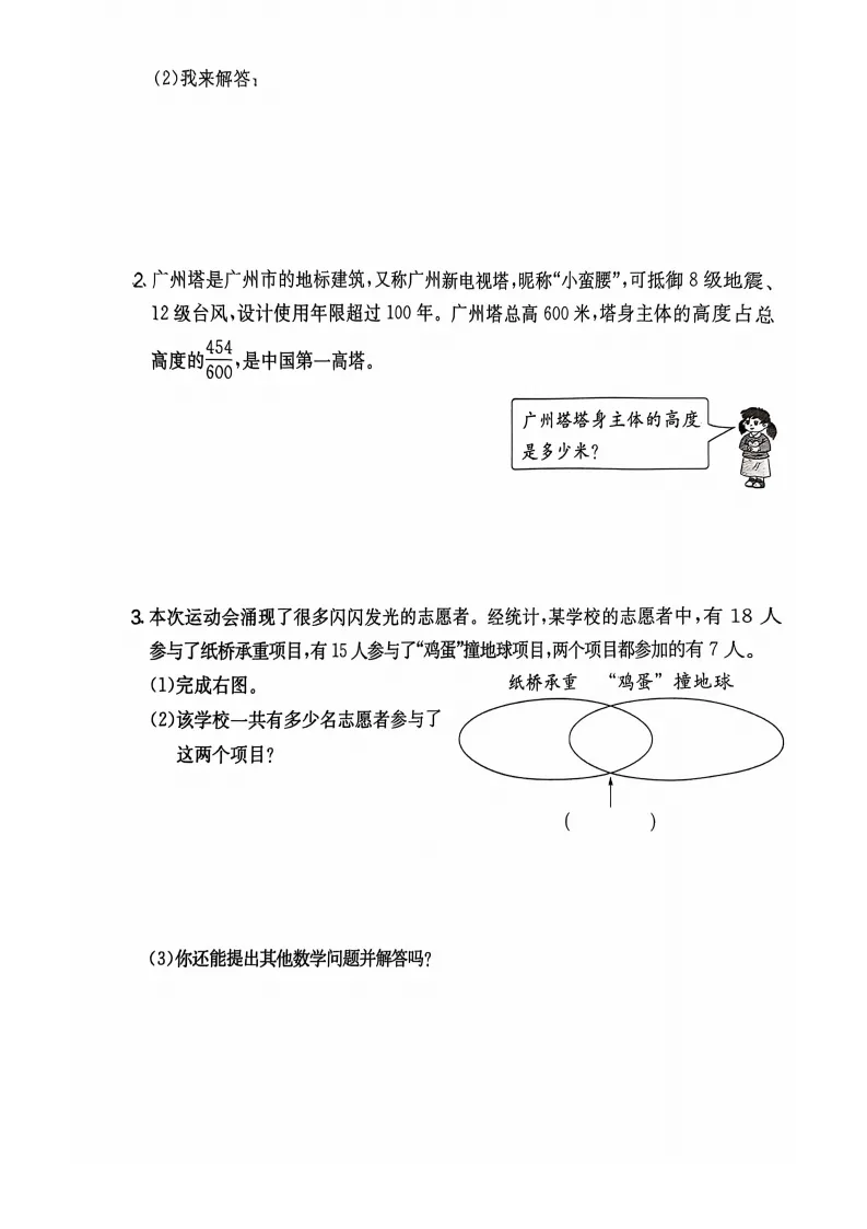 (2)【解析】用容斥原理,总人数 = 参与纸桥承重人数 + 参与 “鸡蛋” 撞地球人数 - 两项都参加的人数(避免重复计算)。18+15-7=33-7=26(名)答:该学校一共有 26 名志愿者参与了这两个项目。
