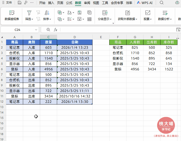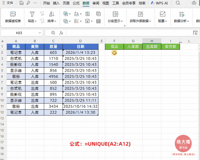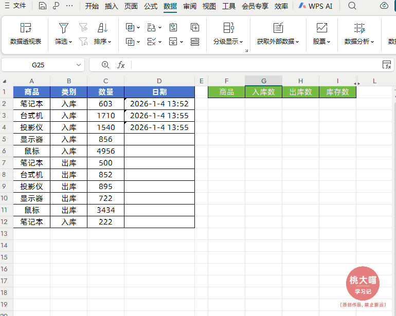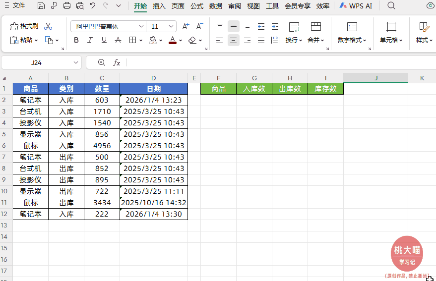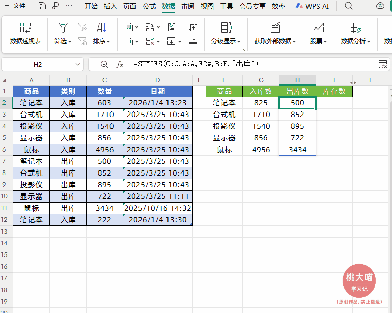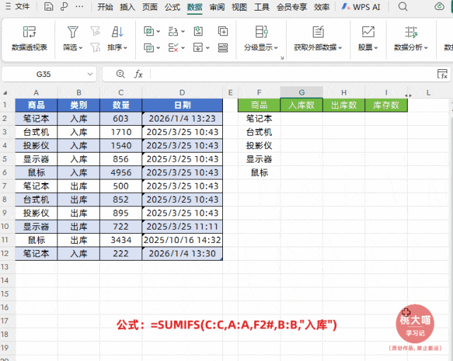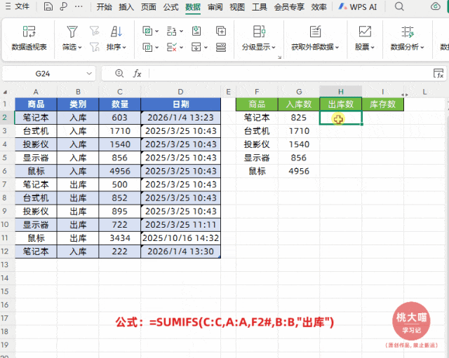 如下图所示,左侧是出入库流水数据,右侧实现根据商品名称实现出入库智能实时统计与实时结存,并且明细表中新增商品名称后,也能自动汇总统计。