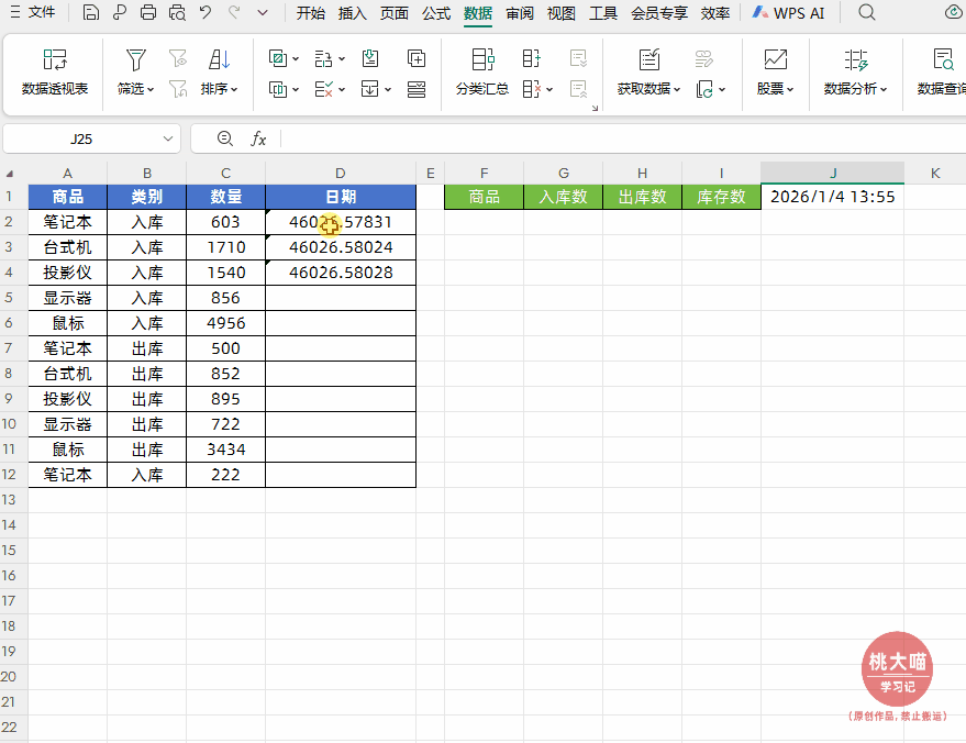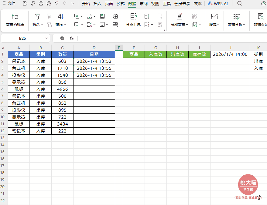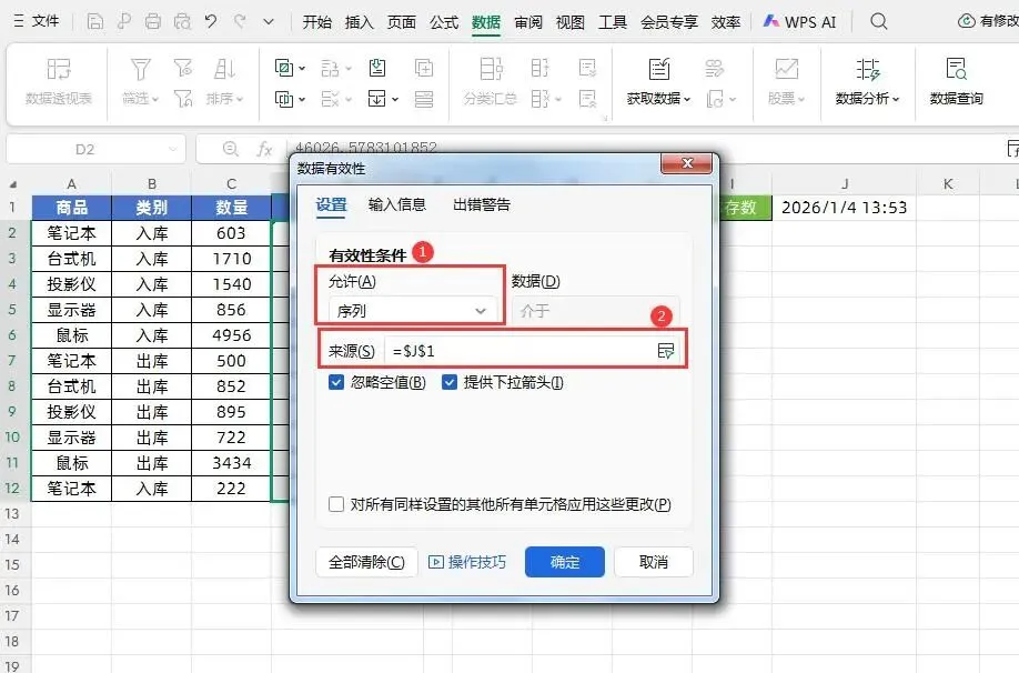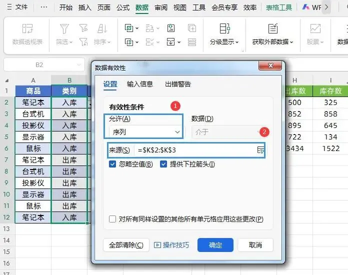 第一步:把出入库流水数据日期/类别单元格设置成可选择的下拉菜单