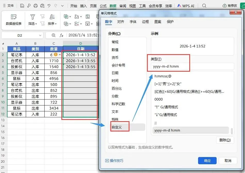 先选择“日期”单元格数据区域→通过快捷键【Ctrl+1】调出【单元格格式】窗口,选中【自定义】在类型中选择【yyyy-m-d h:mm】的显示格式即可,如下图所示