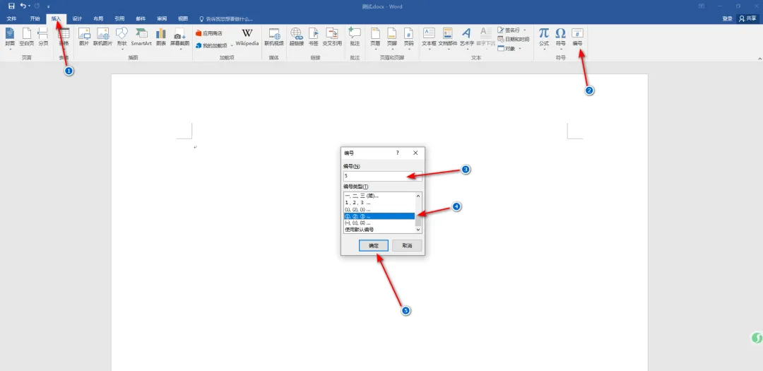 4.比如我们输入数字5,然后再类型编号中选择带圆圈的数字,点击“确定”按钮,可以看到word中多了一个
