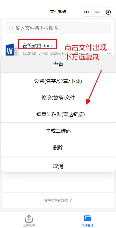 2.复制链接:文件上传成功后,返回小程序首页,进入【文件管理】页面。 点击已上传的目标文件,系统会弹出在线查看页面,点击【一键复制粘贴】按钮,再点击新页面上的【一键复制】,将文件专属链接复制到剪贴板。