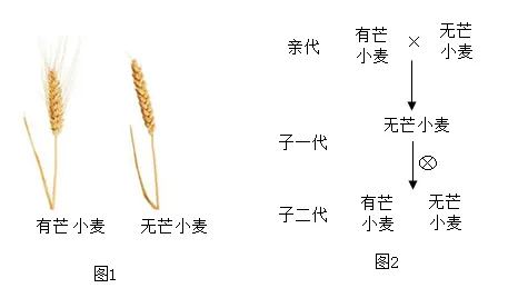 27. 小麦是我国重要的粮食作物之一,是面粉的主要原料。小麦穗可分为有芒和无芒(图1)两种类型,科研人员用有芒小麦与无芒小麦杂交,过程及结果见图2,回答问题。