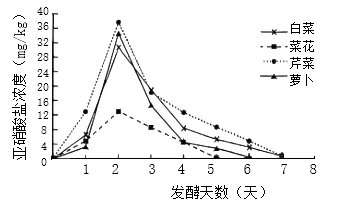 29. 泡菜是一种历史悠久、风味独特的发酵食品,但泡菜在发酵过程中会产生对人体有害的亚硝酸盐。为探究影响泡菜亚硝酸盐浓度的因素,研究人员分别用白菜、菜花、芹菜、萝卜制作泡菜,每日测定泡菜亚硝酸盐浓度,实验结果如下图,回答问题。