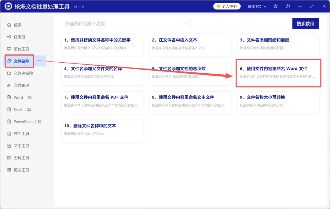 1、打开核烁文档批量处理工具,选择文件名称→使用文件内容重命名Word文件。