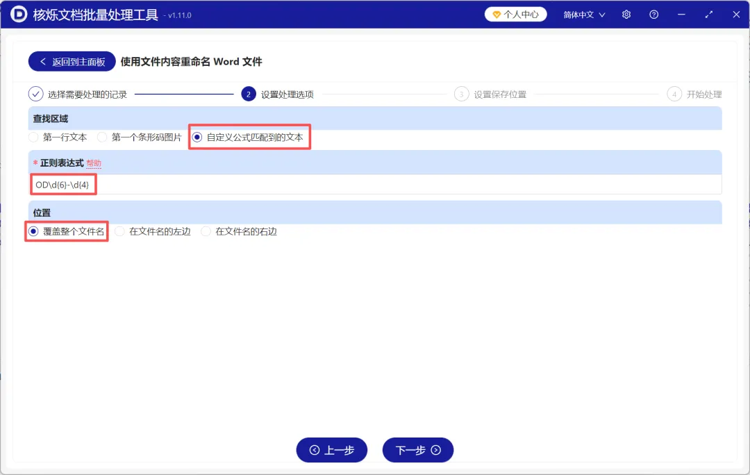 3、选择自定义公式匹配到的文本,并在文本框里填入公式表达式。在示例文件中,我们需要提取订单号作为文件名,因此在这里填入公式OD\d{6}-\d{4}。位置自己任意选择。