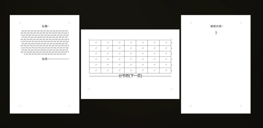 下一页分节符:在一堆文字后,想插入一张横向的页面放表格或者图片,使用下一页分节符。也就是本文开头第二个问题,插入横向的一页的正确方式。如下图这种效果。