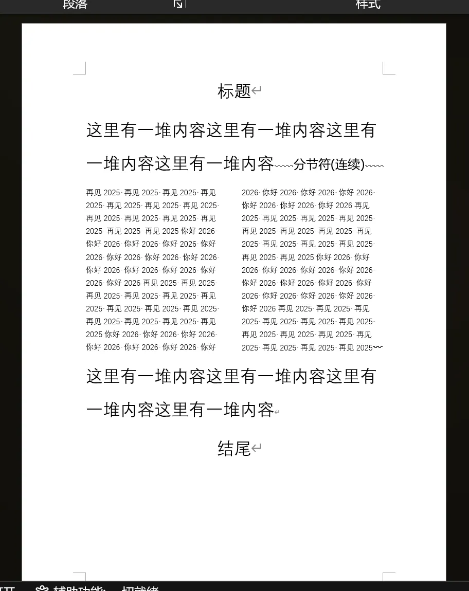 连续分节符:想要在一页中使用不同布局,如下图这种效果。