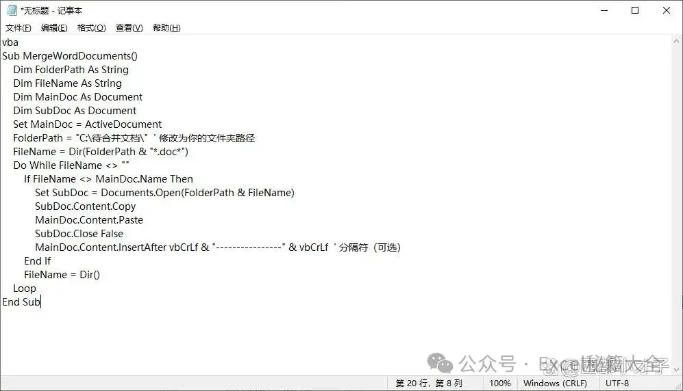 FolderPath = "C:\待合并文档\" ' 修改为你的文件夹路径
