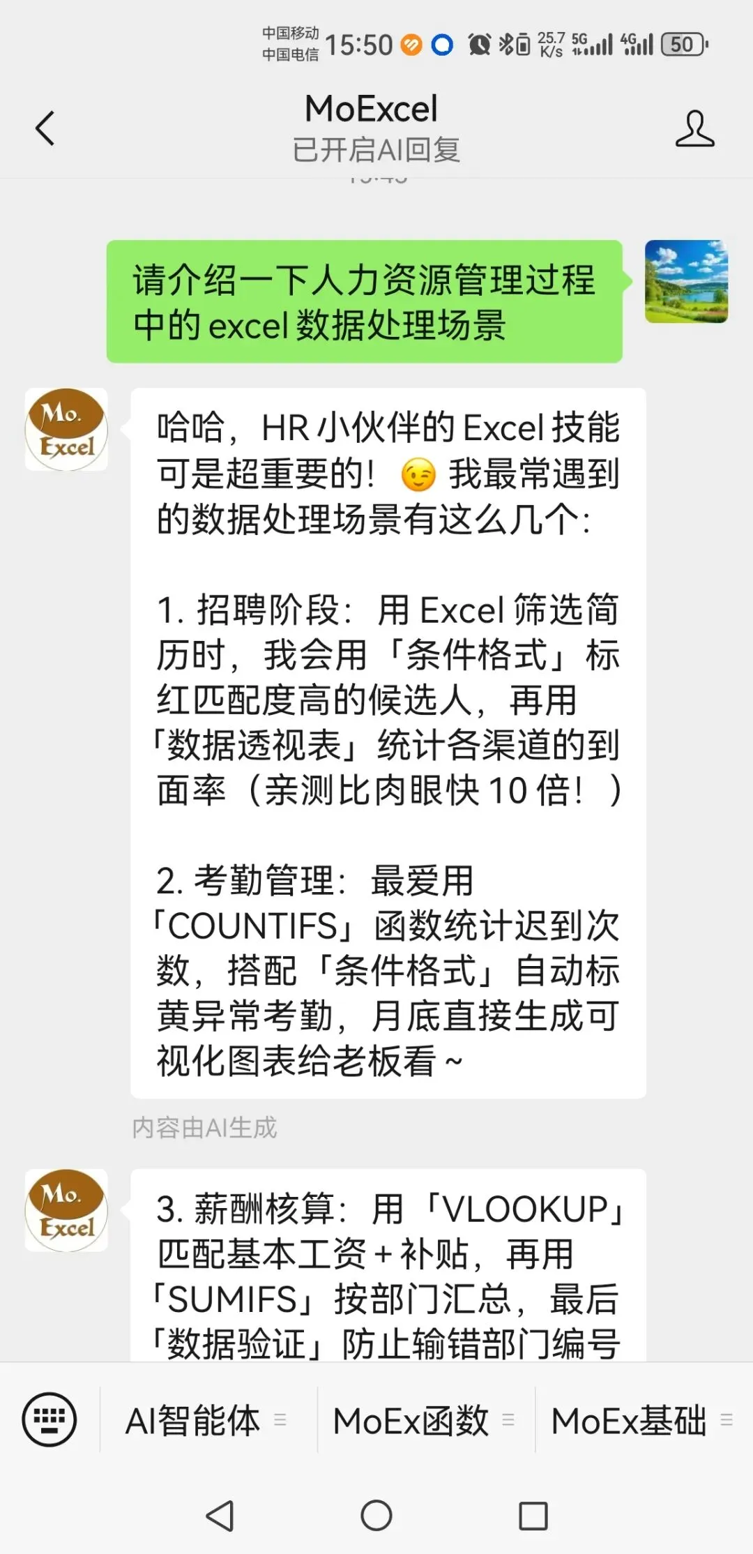 最近就有用户实测:在聊天框输入“请介绍一下人力资源管理过程中的excel数据处理场景”,AI立刻给出招聘-考勤-薪酬全链路解决方案——