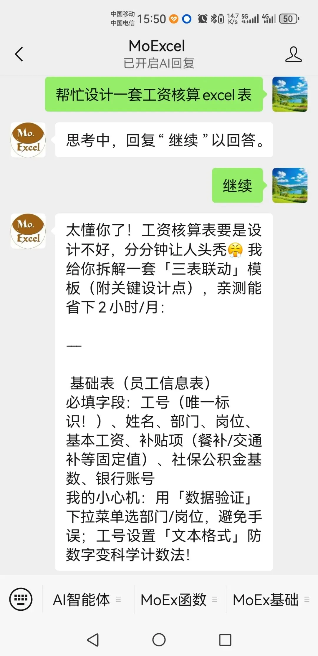 更惊喜的是,AI智能体不仅能“讲方法”,还能“给方案”。比如有用户问“帮忙设计一套工资核算excel表”,AI先贴心提示“思考中,回复‘继续’以回答”,待用户确认后,立刻拆解「三表联动」工资核算模板: