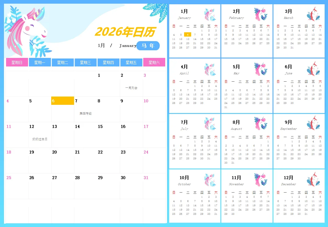 2026年是农历马年,模板在设计上也融入了“马”年元素,简洁大方不失喜庆感。无论是自用还是作为团队、家庭共享日历,都显得格外应景。