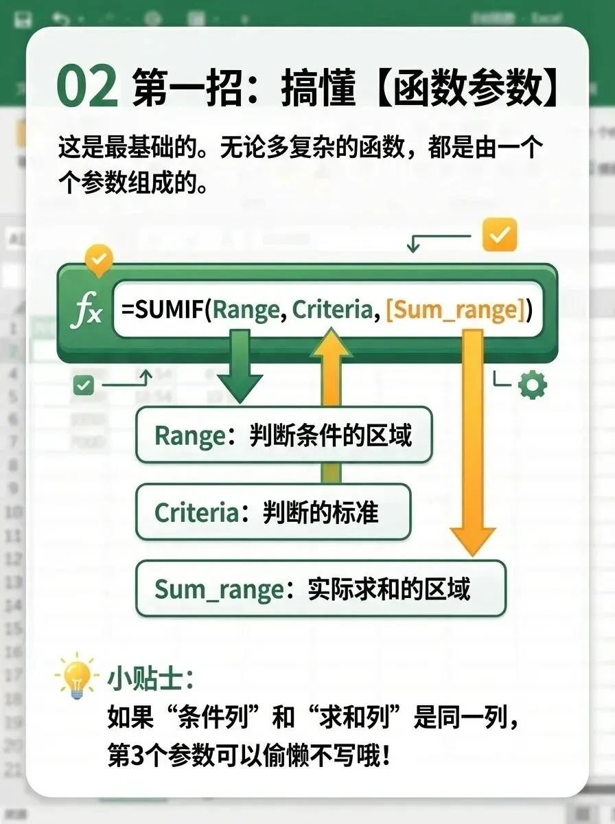 小贴士:当“条件列”和“求和列”是同一列时,第三个参数可以省略。先吃透函数的参数定义,是拆解公式的第一步。