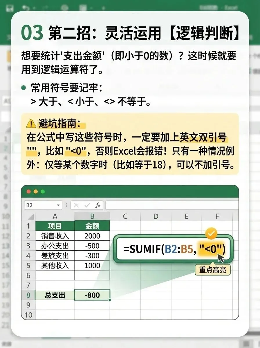 例如,要统计所有支出(金额小于0),公式为:=SUMIF(B2:B5, “<0”)。这里的“<0”就是一个完整的条件文本。记住,只有纯粹等于某个数值时(如“=100”),等号才可以省略不写。