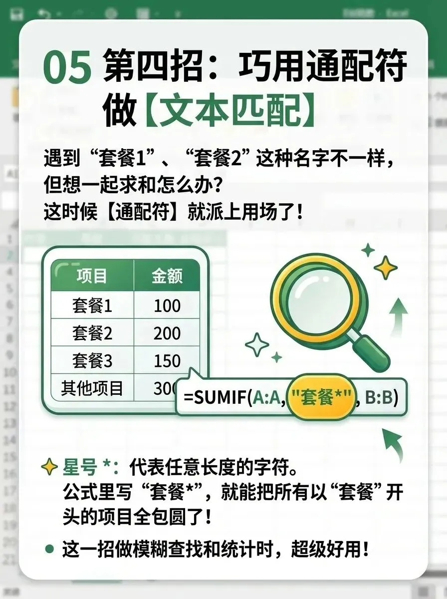当你要处理像“套餐1”、“套餐2”、“套餐A”这类有共同特征的文本时,精确匹配就不好用了。这时,通配符是你的好帮手。