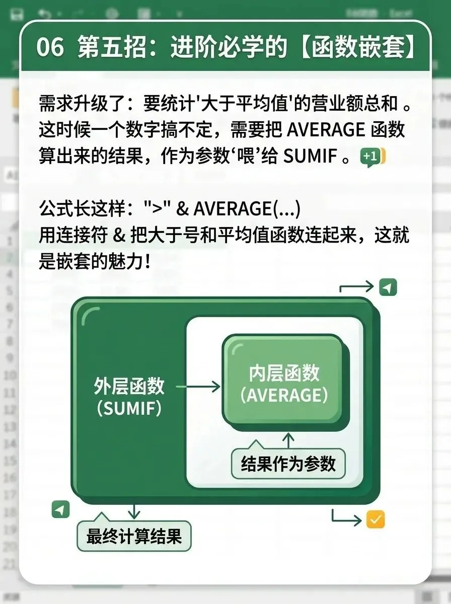 外层:用连接符 & 将“>”和平均值结果组合成新条件,交给SUMIF去执行。