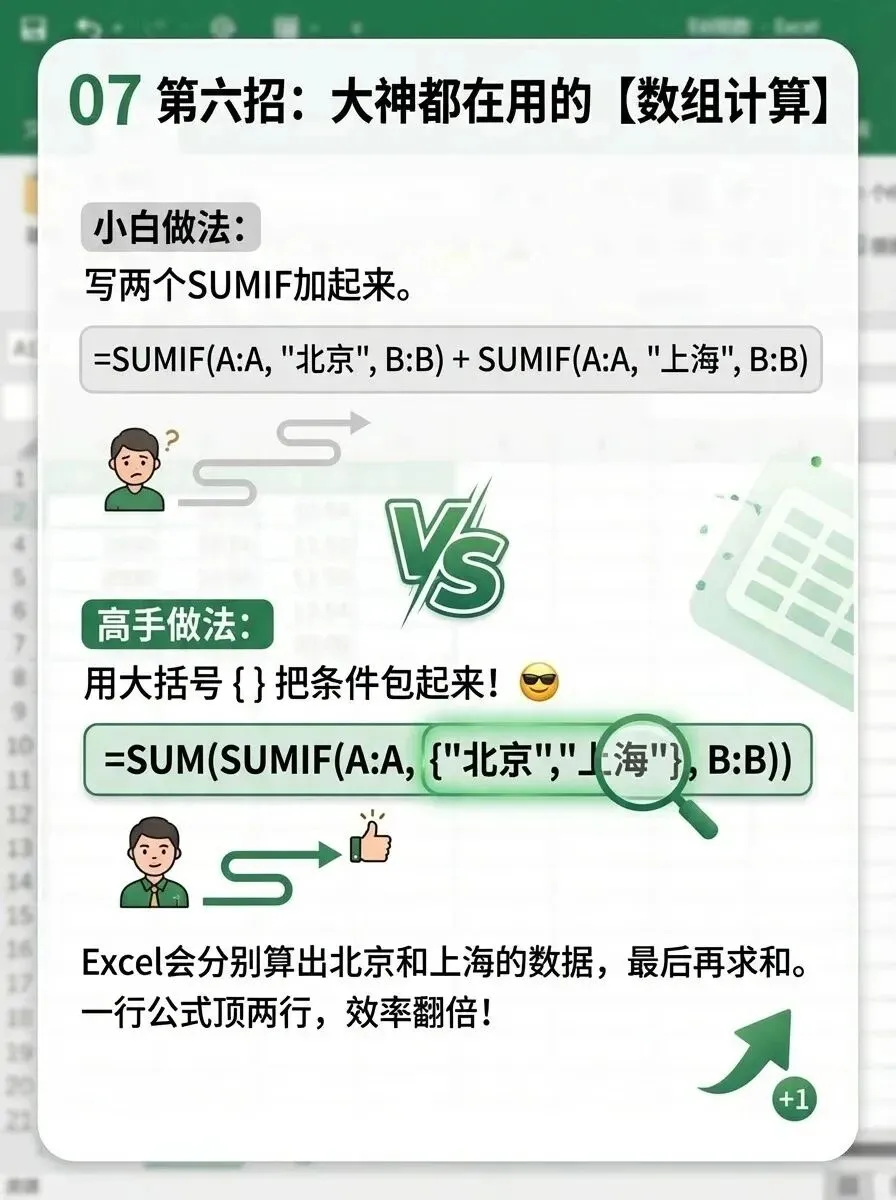 这是提升效率的利器。传统做法是分别计算再相加,比如:=SUMIF(A:A,“北京”,B:B) + SUMIF(A:A,“上海”,B:B)。