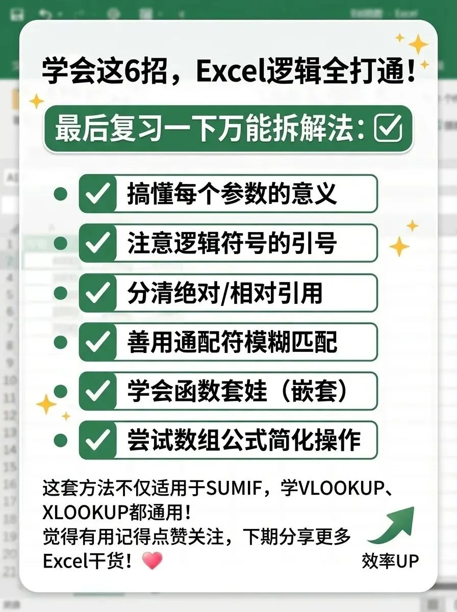 这套思维方法不仅适用于SUMIF,在学习VLOOKUP、XLOOKUP、FILTER等所有函数时都通用!掌握了它,你就拥有了读懂和编写复杂公式的底层能力。