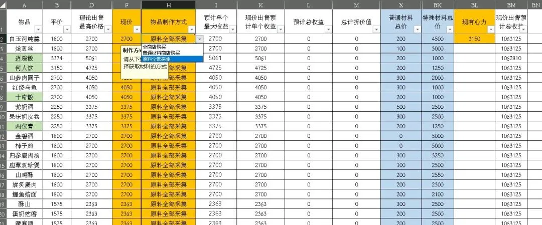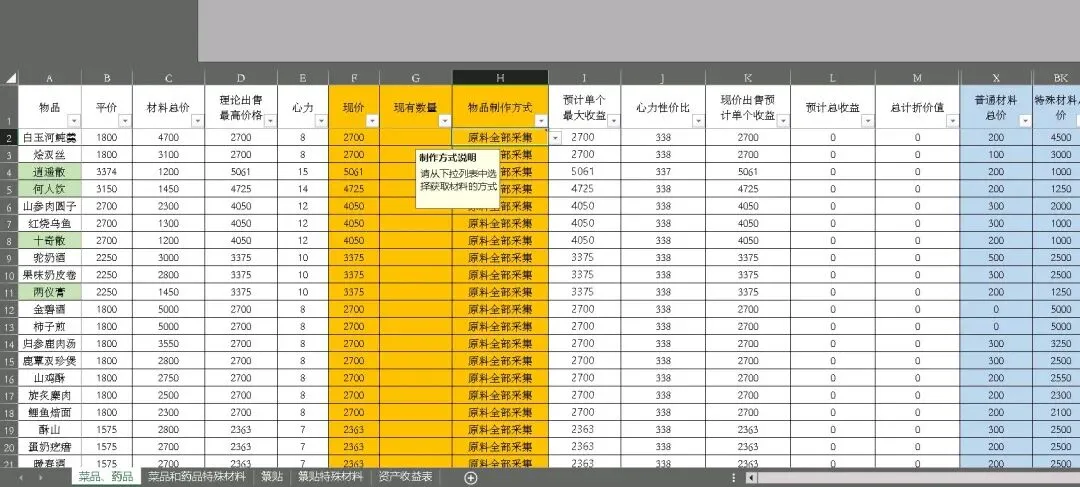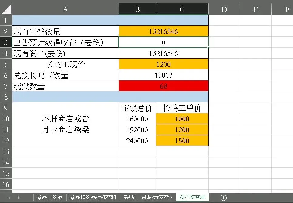 这是模型的核心价值——表格会自动算出「心力性价比」(截图中所有物品材料全采集情况下该数值为338),即每点心力能创造的收益。调整金色单元格的制作方式后,不同制作方式会导致该数据的变化,导致心力性价比不同。所有数据会自动汇总到资产收益表(截图中显示现有宝钱13216546、绕梁数量68),直观呈现不同选择的收益差异。例如,若选择全采集制作白玉河鲀羹,虽成本低但心力消耗大,性价比可能低于直接购买材料。