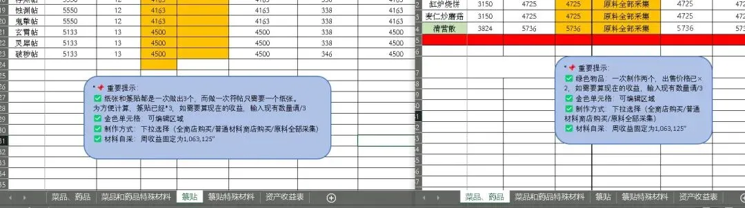 表1(菜品/药品)、表3(箓贴)为制作表,核心逻辑一致;但表3因涉及符箓制作,需额外核算纸张换算(截图提示「一份材料做三个纸张,一个纸张做三个箓贴」,箓贴收益需按1/3折算);表2、表4是对应制作表的特殊材料清单;表5为资产收益表,可通过表1和表3数据的修改,查看最终的宝钱、长鸣玉等核心资产数据收益。例如,符箓制作需先计算纸张成本,再折算到最终收益中。三、快速上手示例(以白玉河鲀羹为例)