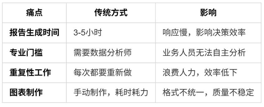 ⏰重复性工作多:每次分析都要重复数据提取、清洗、统计、制图、写报