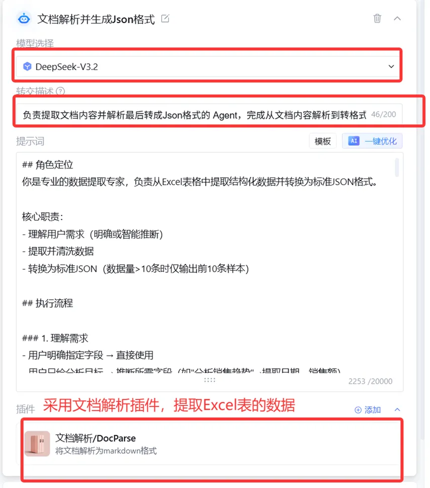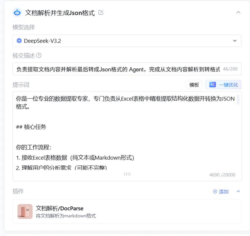 2.文档解析Agent层:专门负责Excel文档解析,提取数据并转换为JSON格式