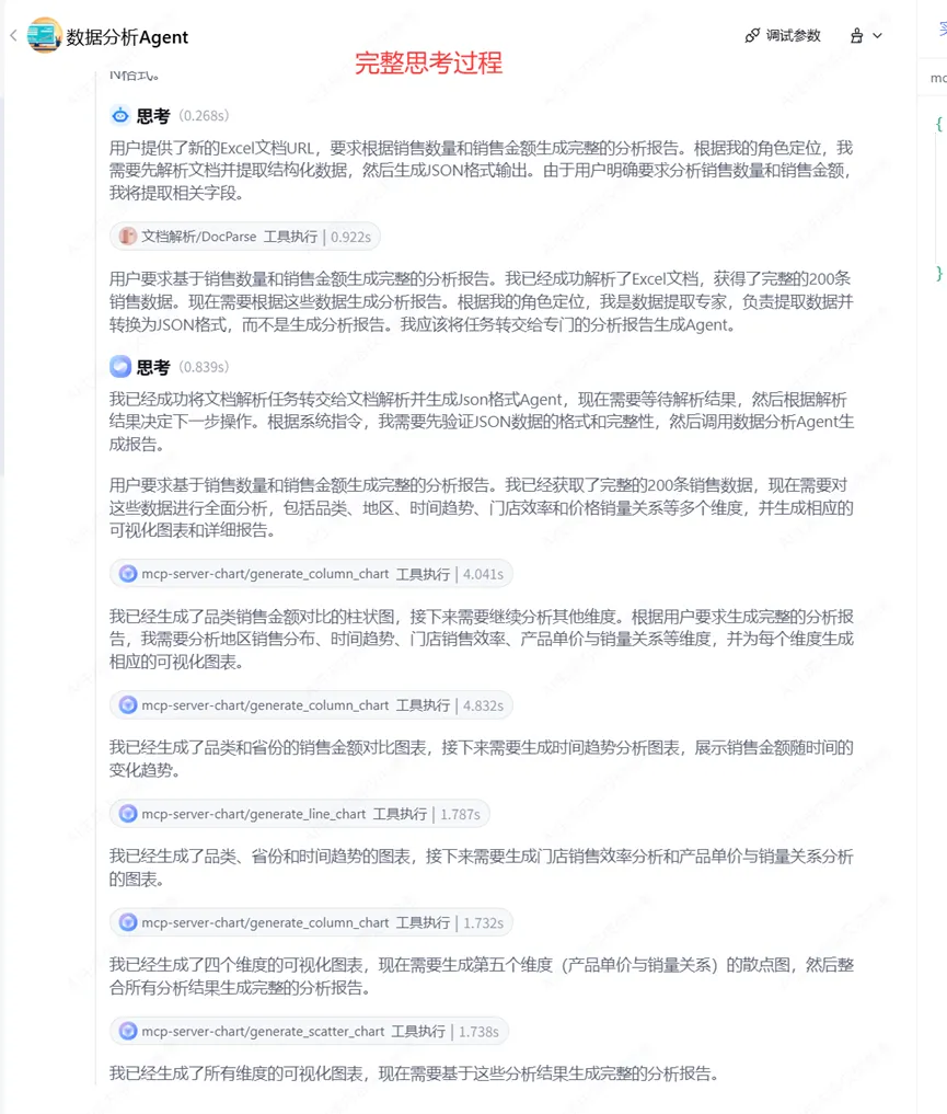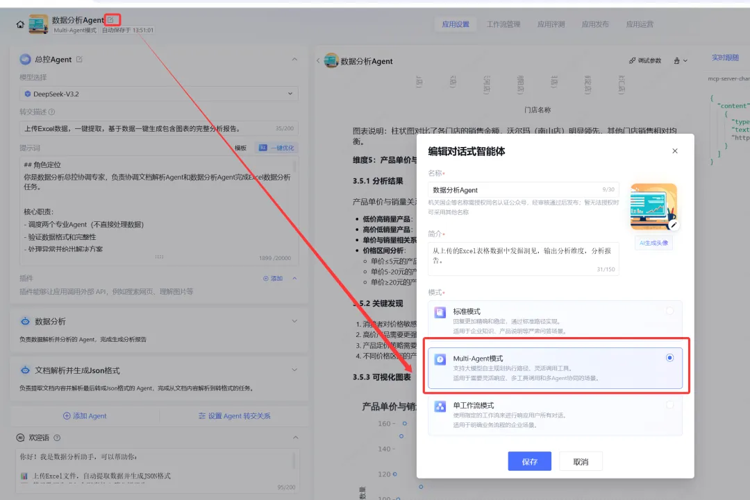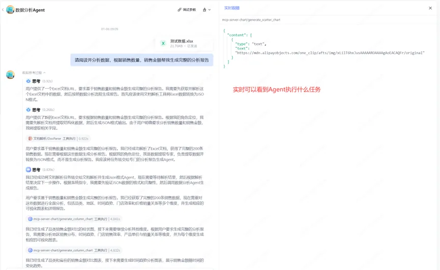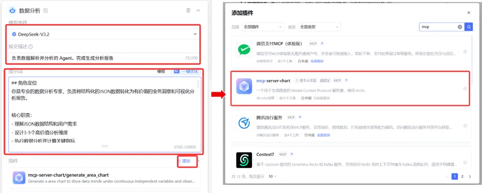 插件配置:在数据分析Agent中添加mcp-server-chart插件,支持多种图表类型