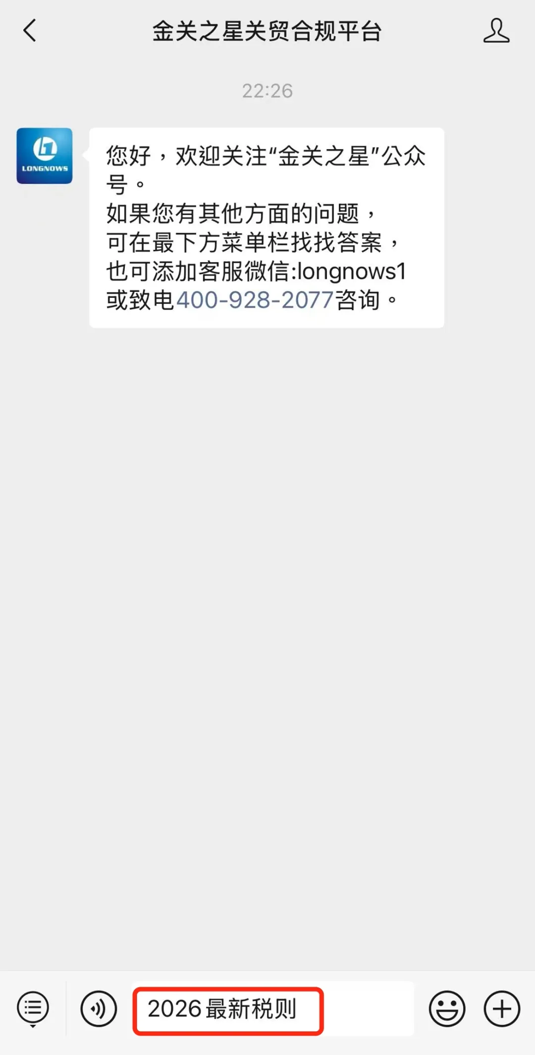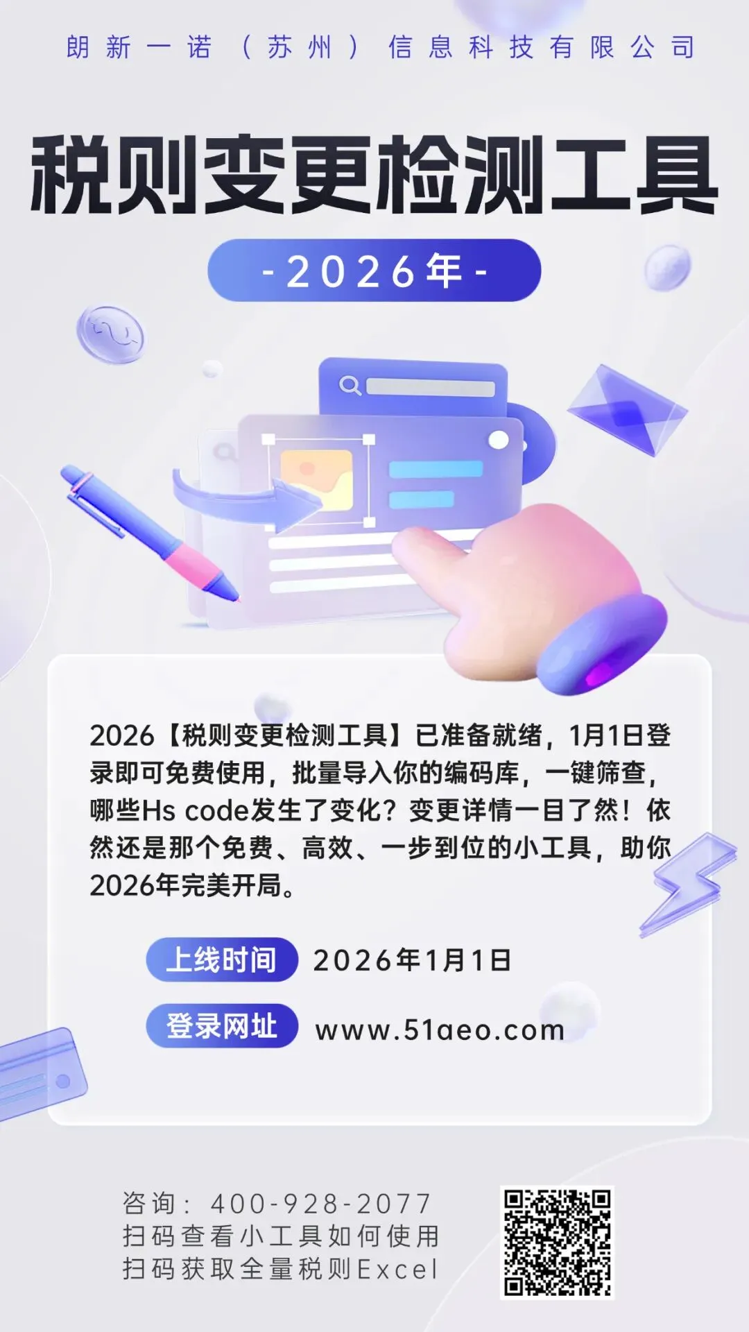 距离1月1日税则变更已经过去好几天,零零散散还是每天都有一些小调整,常常在后台收到小伙伴们私信如何查询税则变更?如何获取最新的「2026全量税则Excel表」?其实,查询哪些Hs code发生了变化?以及更加详细的税则变更详情,只需要登录【www.51aeo.com】即可免费使用小工具,一键导入你的编码库,方便快捷。那最新的Excel,关务朋友们可以在【金关之星关贸合规平台】公众号的首页回复:2026最新税则,即刻获取,如果还不了解,可查看下方的使用说明,更加详细哦。👇登录网站【www.51aeo.com】,点击右侧海报,进入工具使用界面 下载模板后,输入需检测的HScode后上传,生成结果,查看变更分析 下载最新全量税则Excel