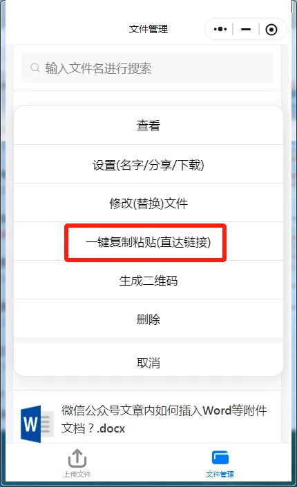 上传后会自动生成专属链接,点击对应文件,选择「一键复制粘贴(直达链接)」一会粘贴到公众号文章正文里。
