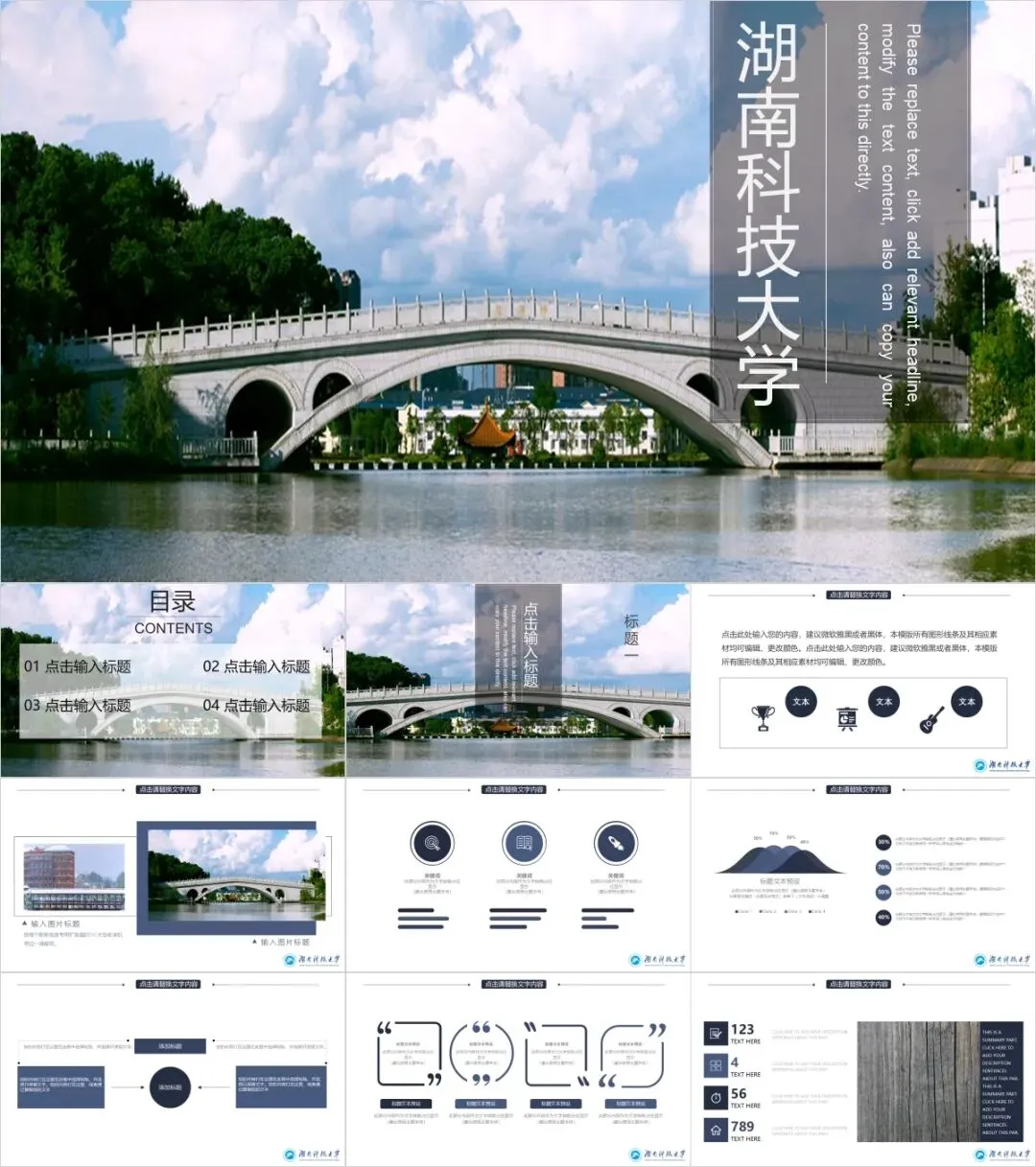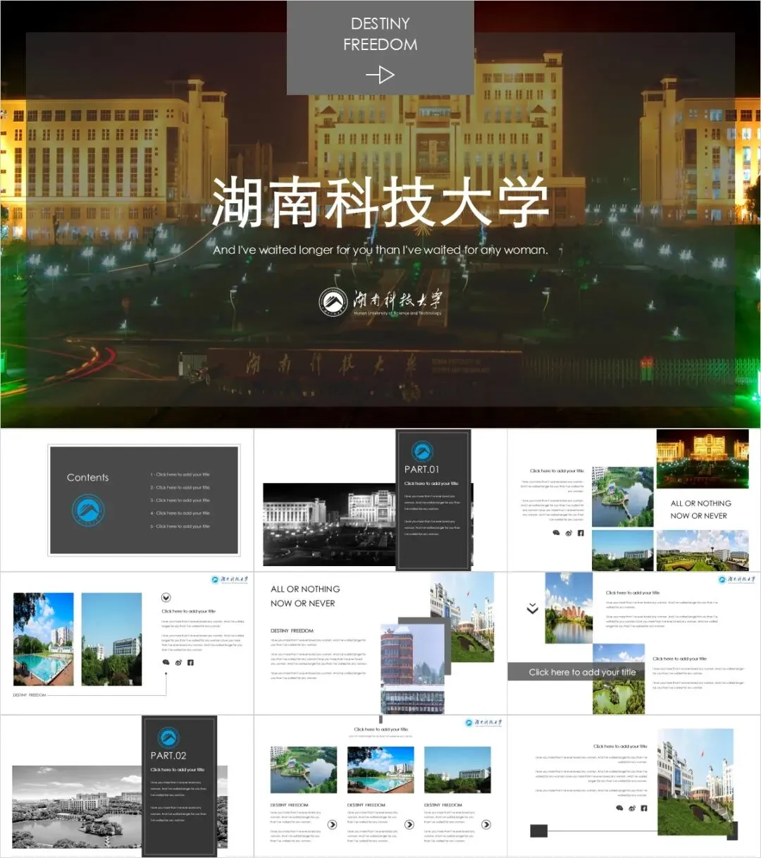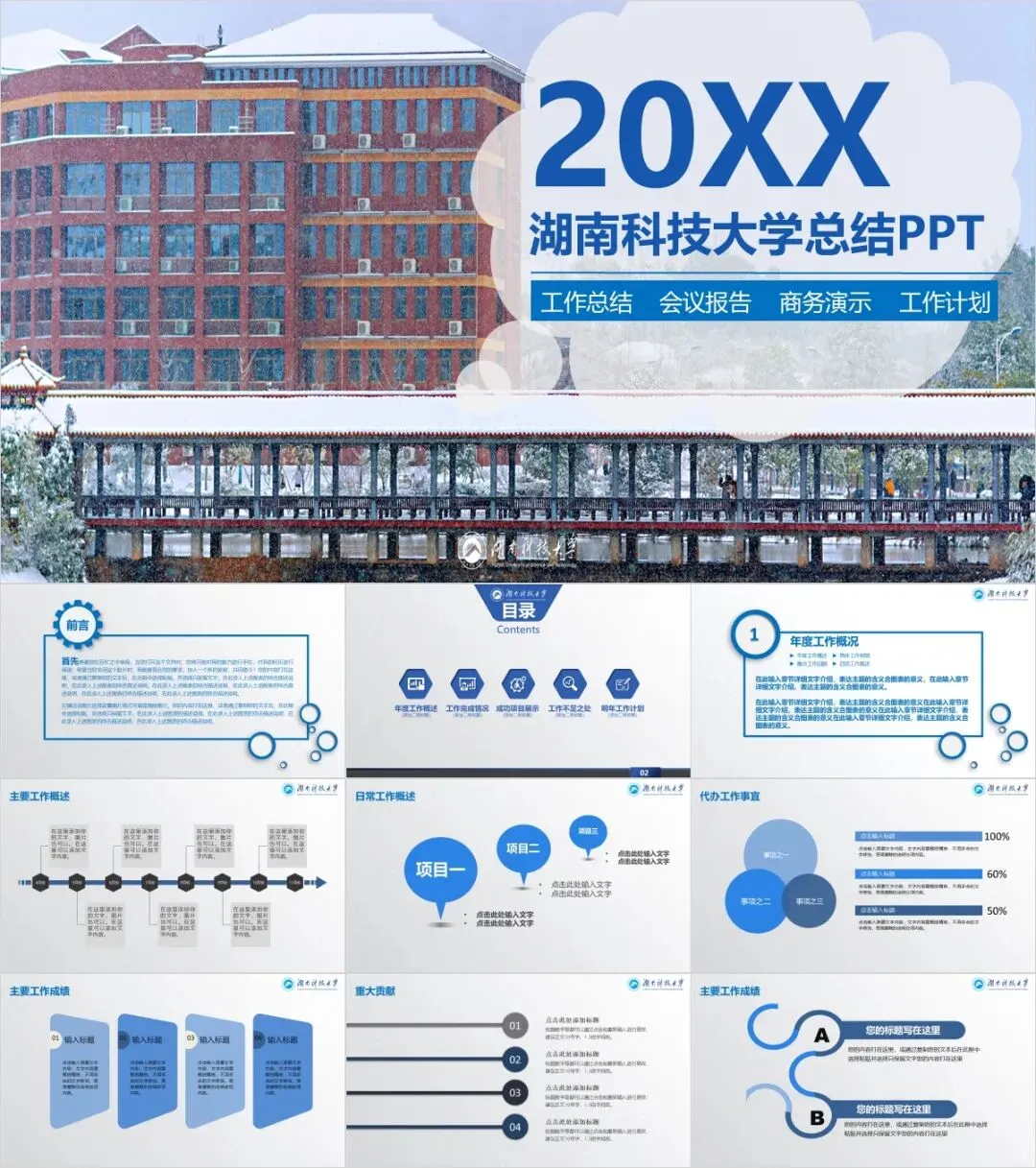 以上是我们为大家准备的湖南科技大学专属PPT模板,文中的所有板式都是可编辑的,大家可以上传替换自己喜欢的校园美景,做出具有自己风格的专属PPT哦!其他同学也可以给我留言