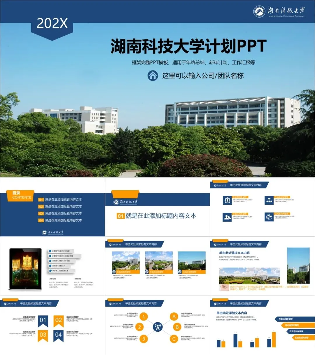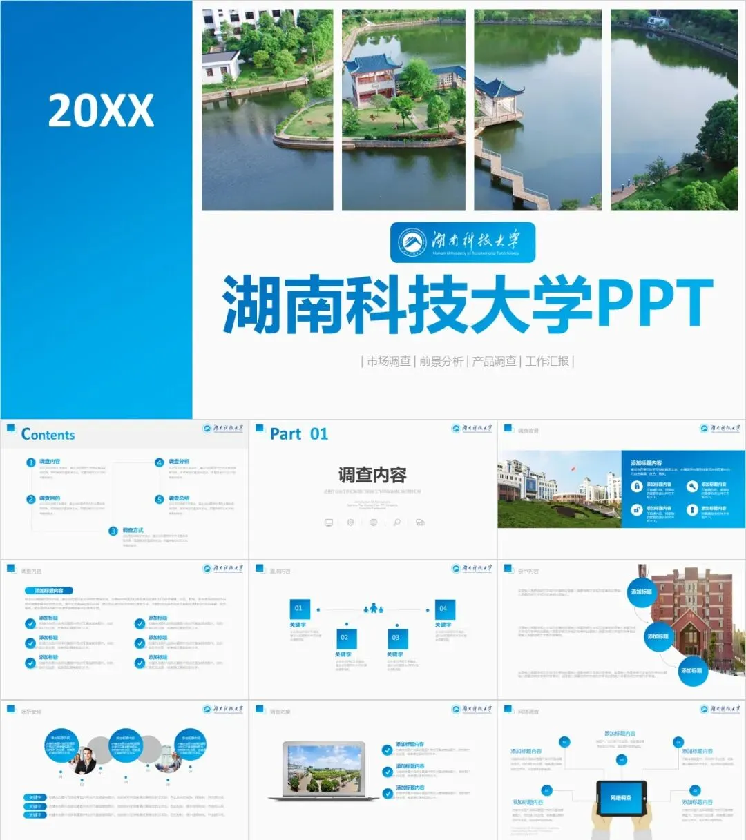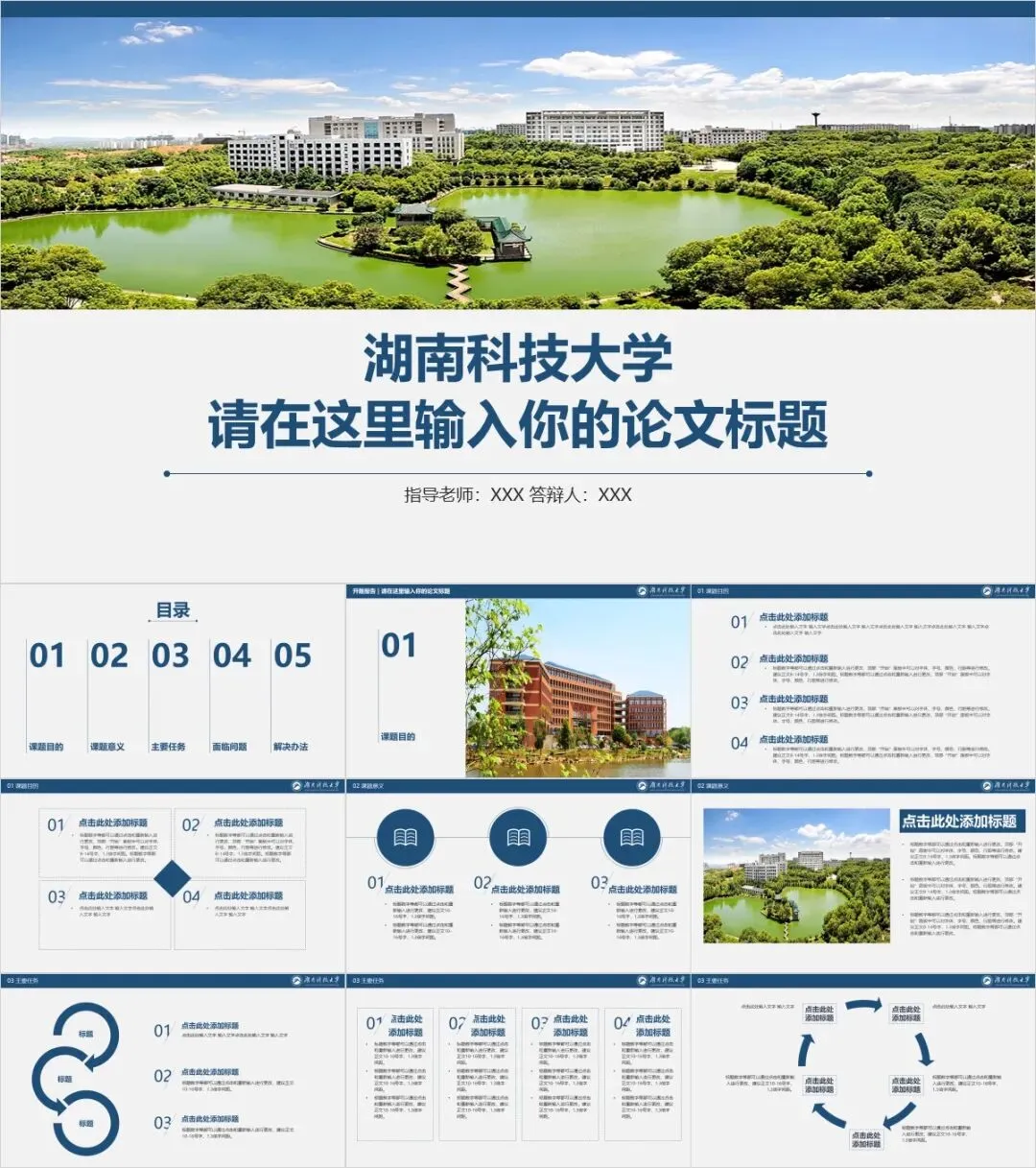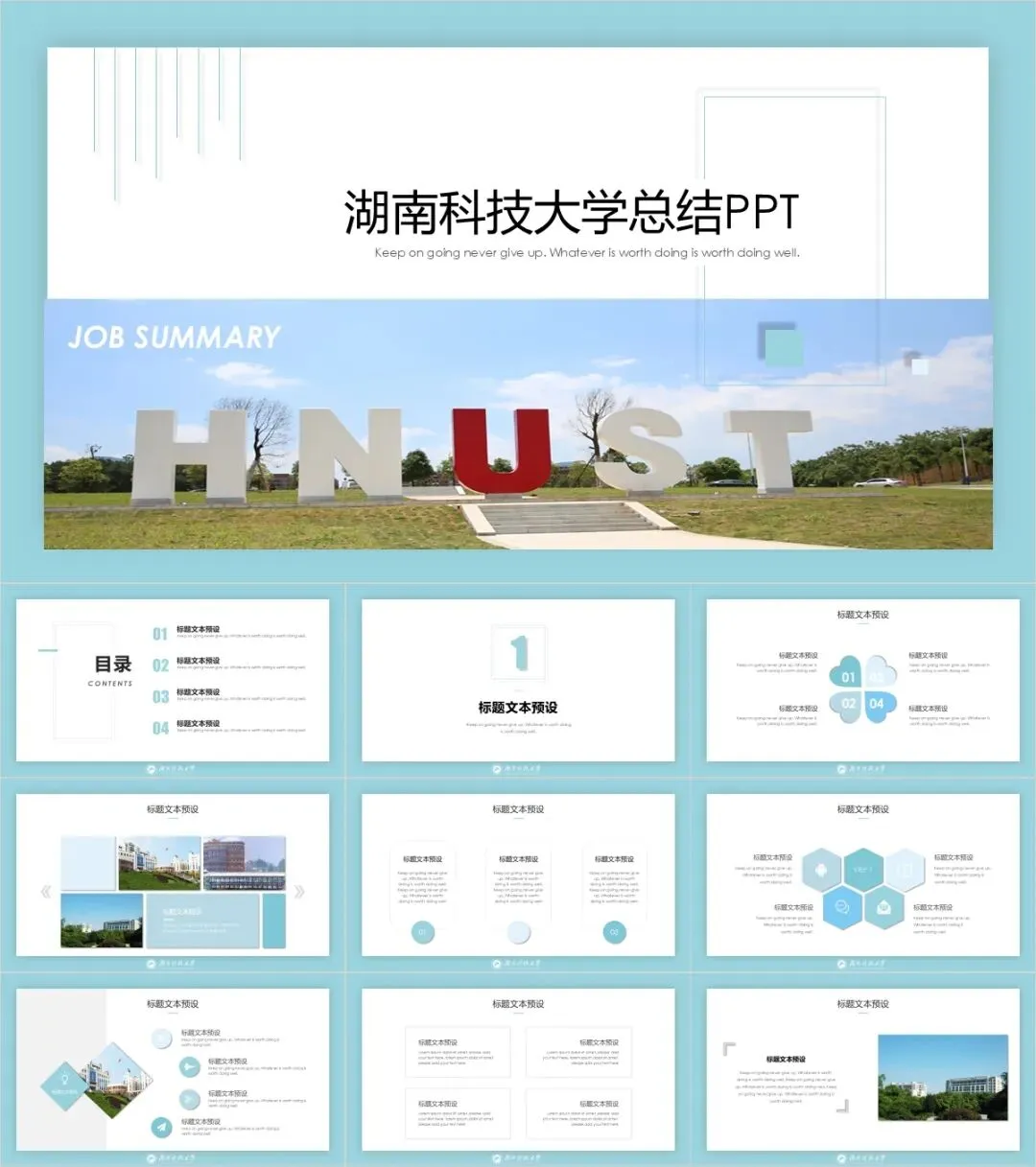 以上是我们为大家准备的湖南科技大学专属PPT模板,文中的所有板式都是可编辑的,大家可以上传替换自己喜欢的校园美景,做出具有自己风格的专属PPT哦!其他同学也可以给我留言