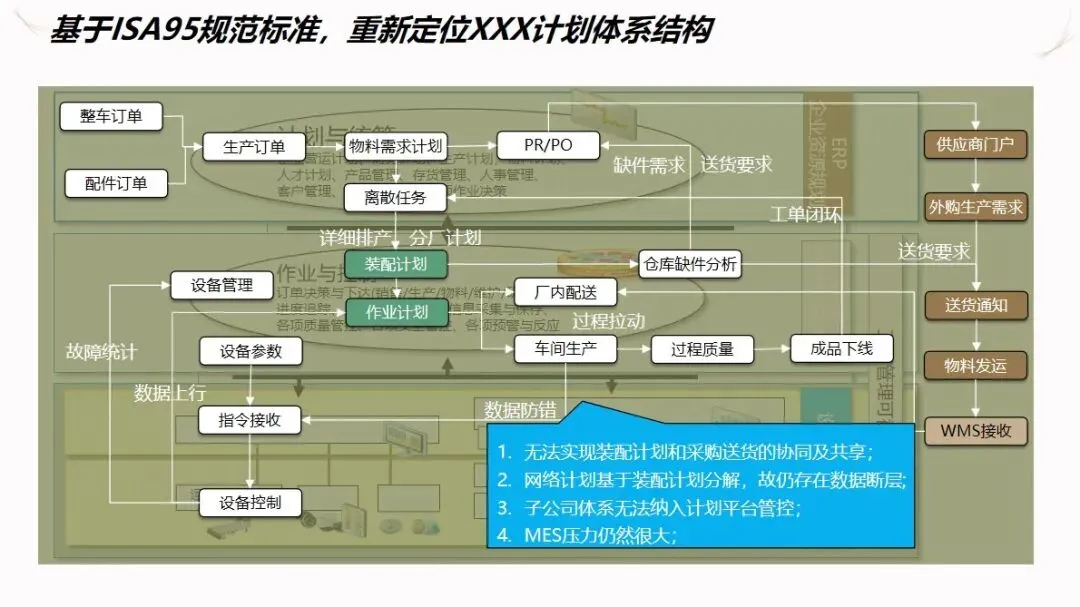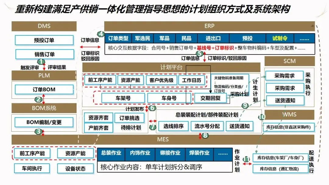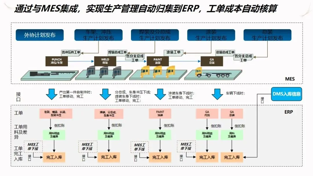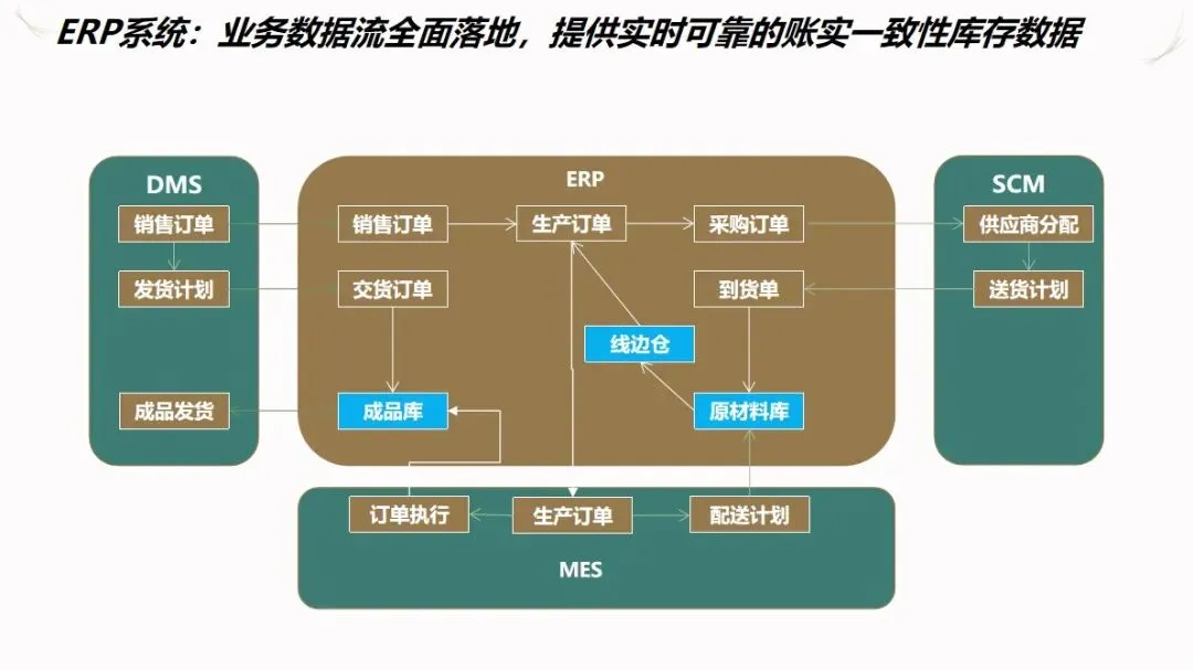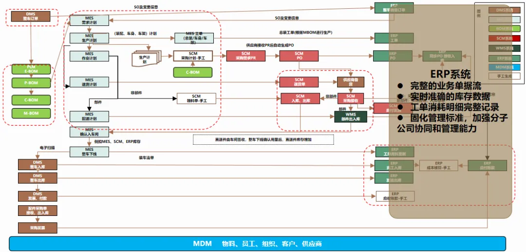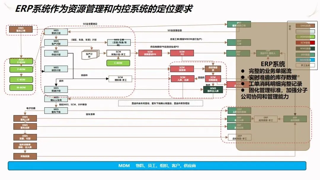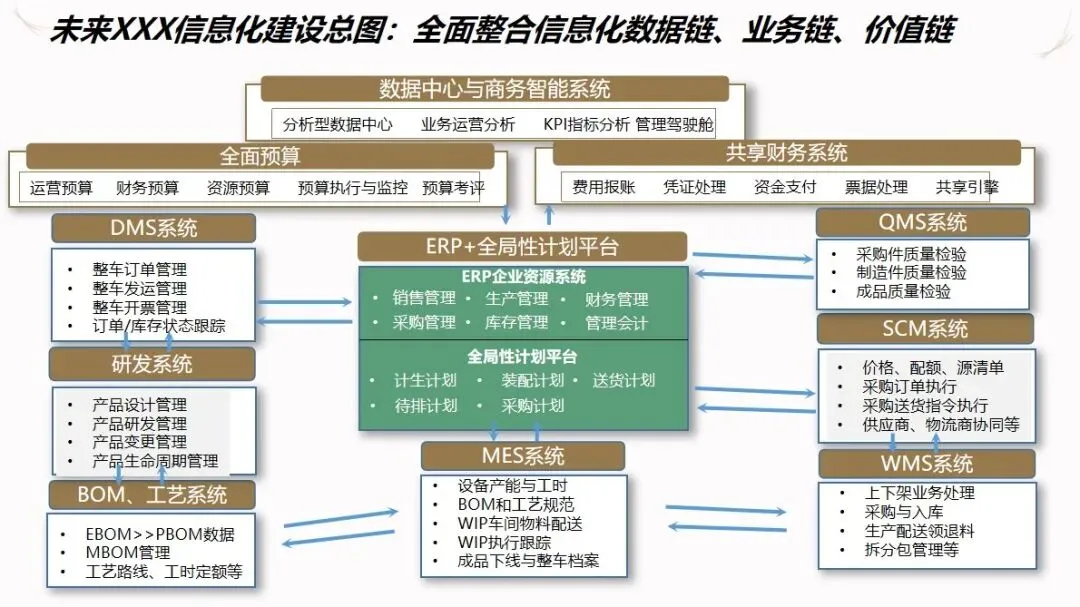 汽车企业 ERP项目的信息化解决方案是以企业资源计划(ERP)为核心,整合制造执行系统(DMS)、制造执行系统(MES)、供应链管理系统(SCM)、生产现场管理系统(WMS)等多种业务系统,建立起覆盖集团控制、生产经营和财务核算等各个环节的集成化的管理平台,打通数据、业务和价值链,加强各子公司之间的协作,提高企业的整体运作效率和控制水平。