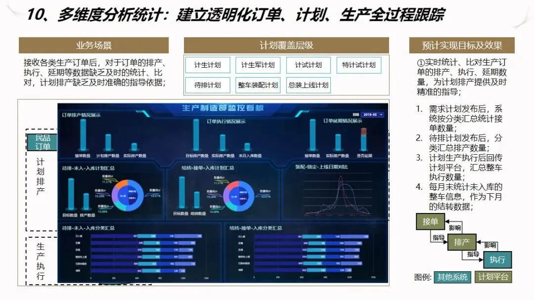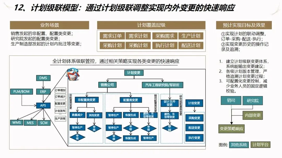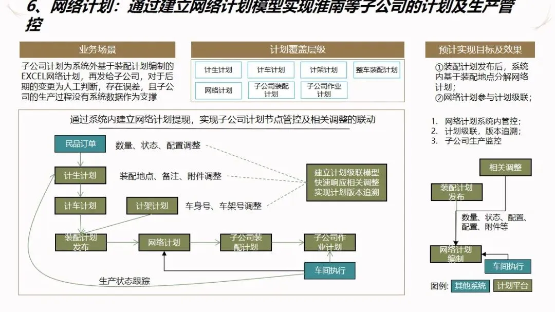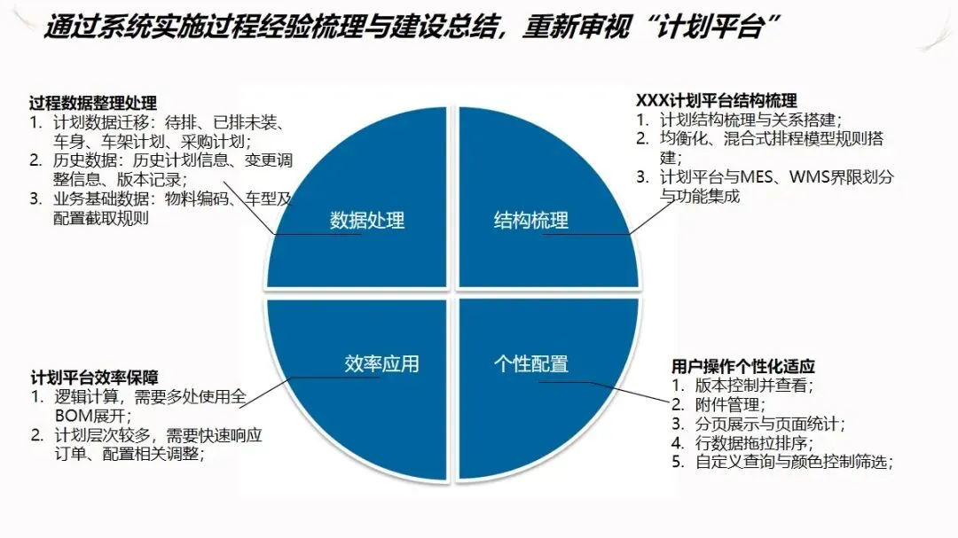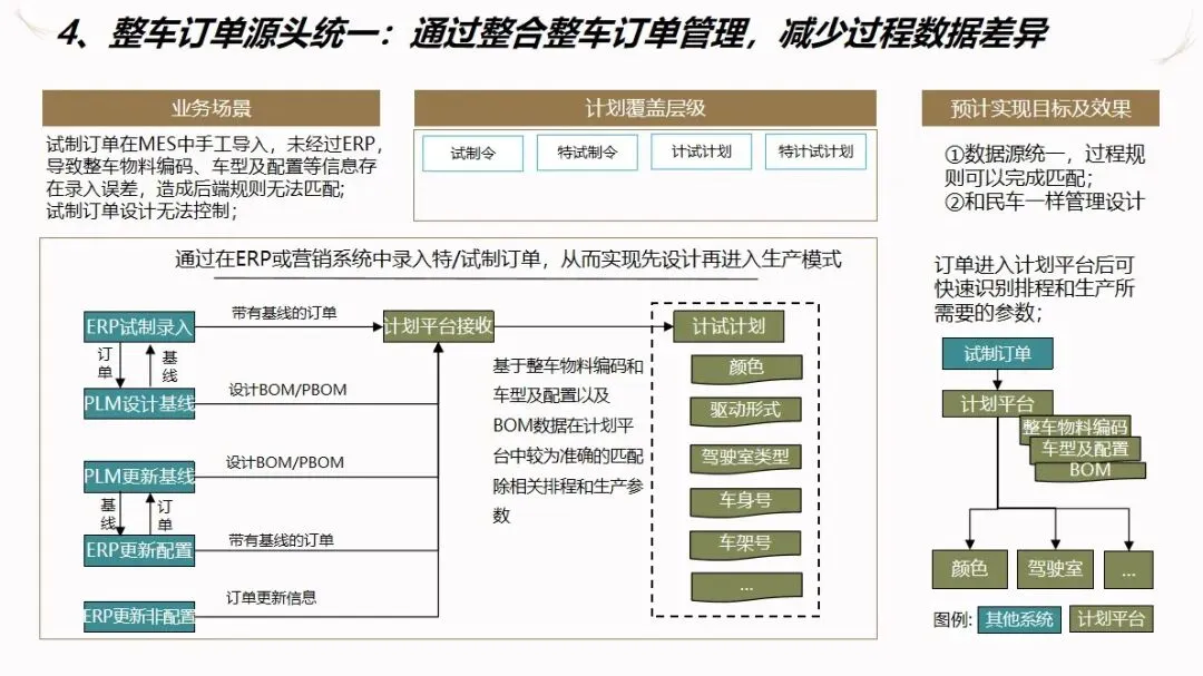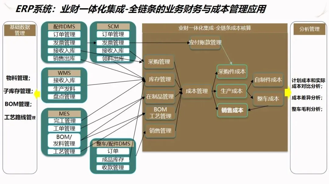 汽车企业 ERP项目的信息化解决方案是以企业资源计划(ERP)为核心,整合制造执行系统(DMS)、制造执行系统(MES)、供应链管理系统(SCM)、生产现场管理系统(WMS)等多种业务系统,建立起覆盖集团控制、生产经营和财务核算等各个环节的集成化的管理平台,打通数据、业务和价值链,加强各子公司之间的协作,提高企业的整体运作效率和控制水平。