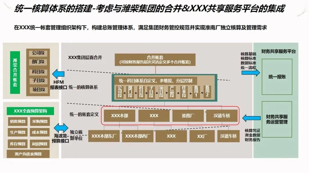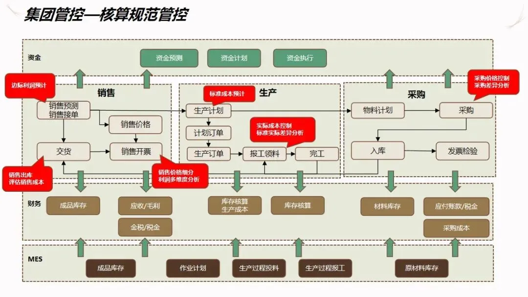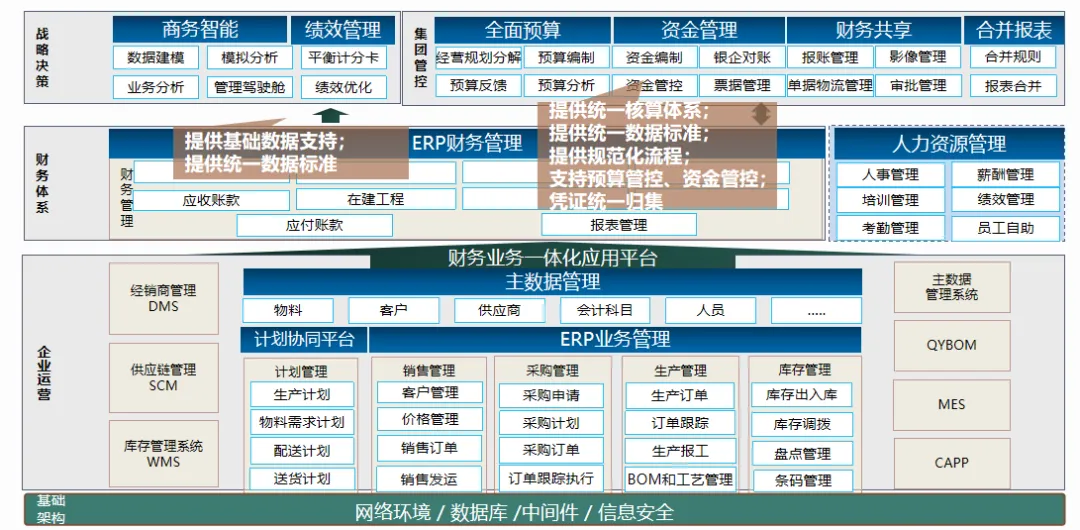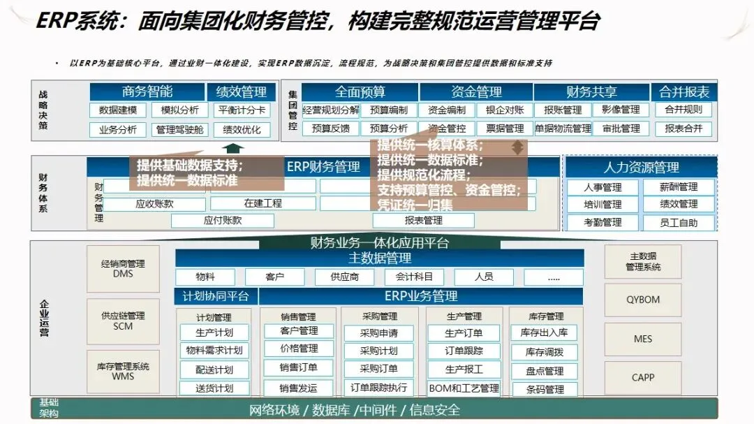 方案的核心是围绕“企业资源计划+深度集成多系统”构建的体系结构,在统一的主数据基础上实现了物料、顾客和供应商等基本信息的规范化。同时,建立了包含全面预算,财务共享,管理驾驶舱在内的集团级控制与管理平台,实现了对企业战略决策的数据支持,实现了企业集团的统一核算和各子公司的独立核算。