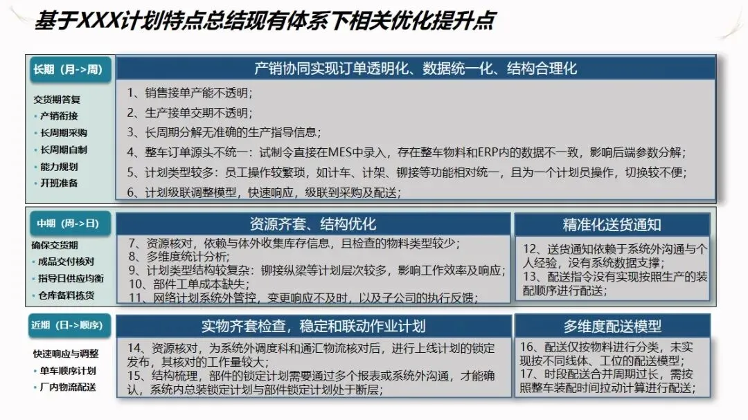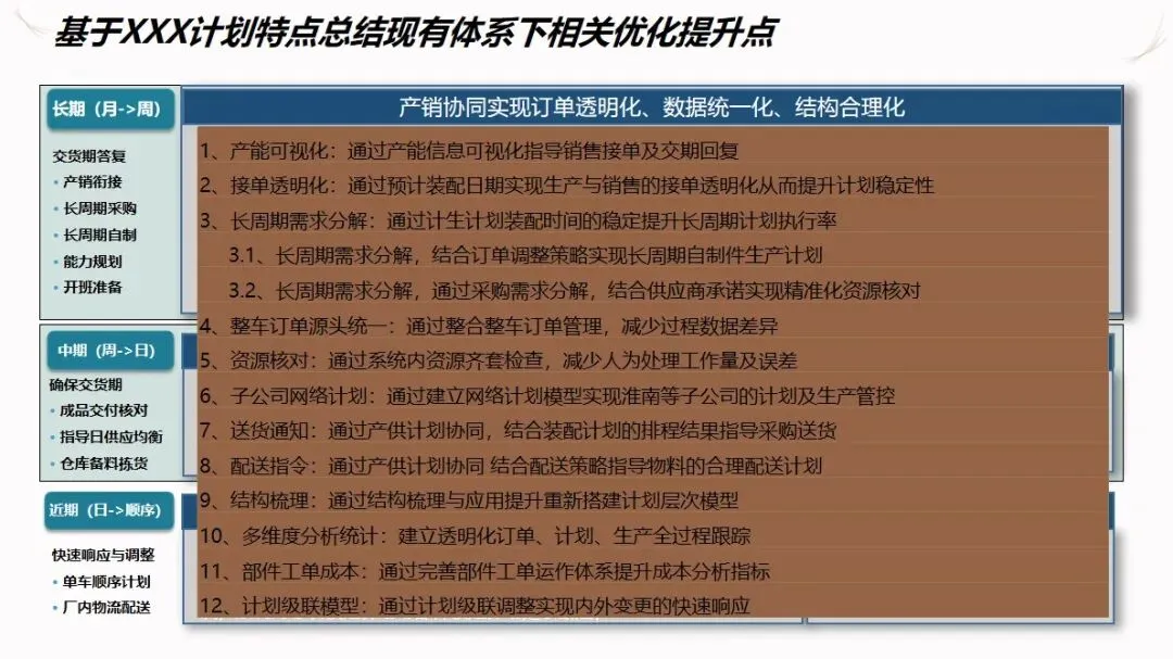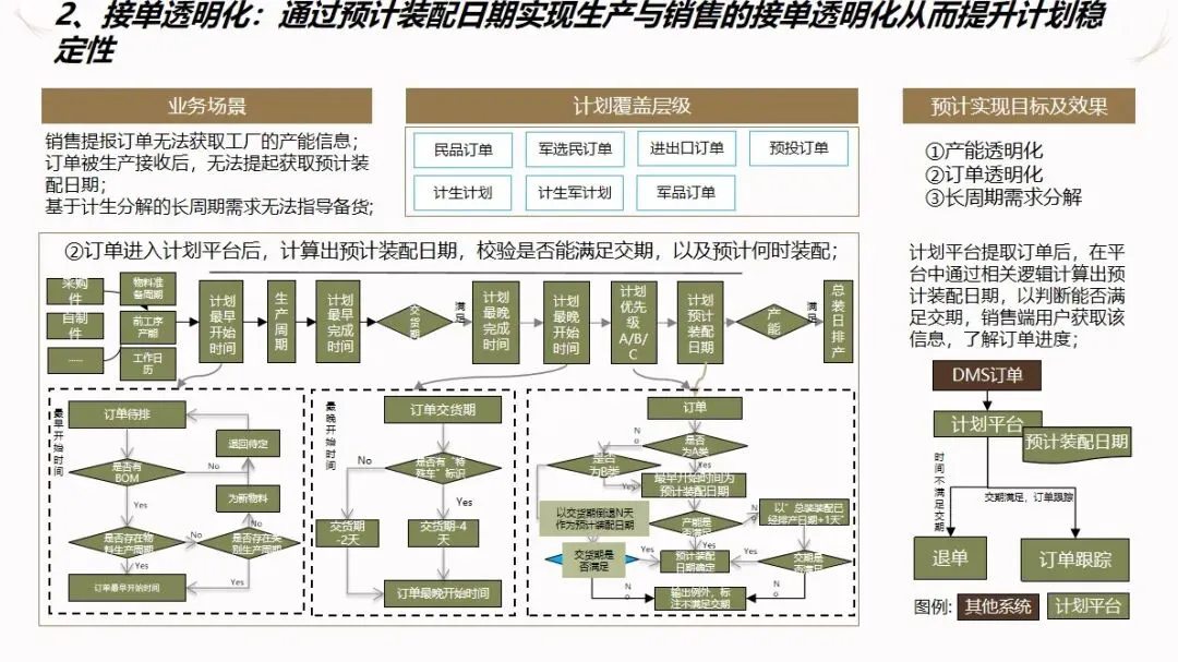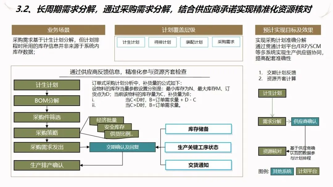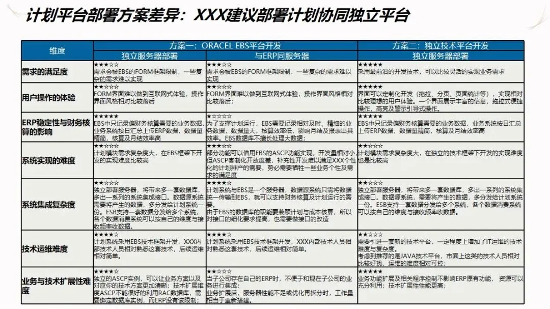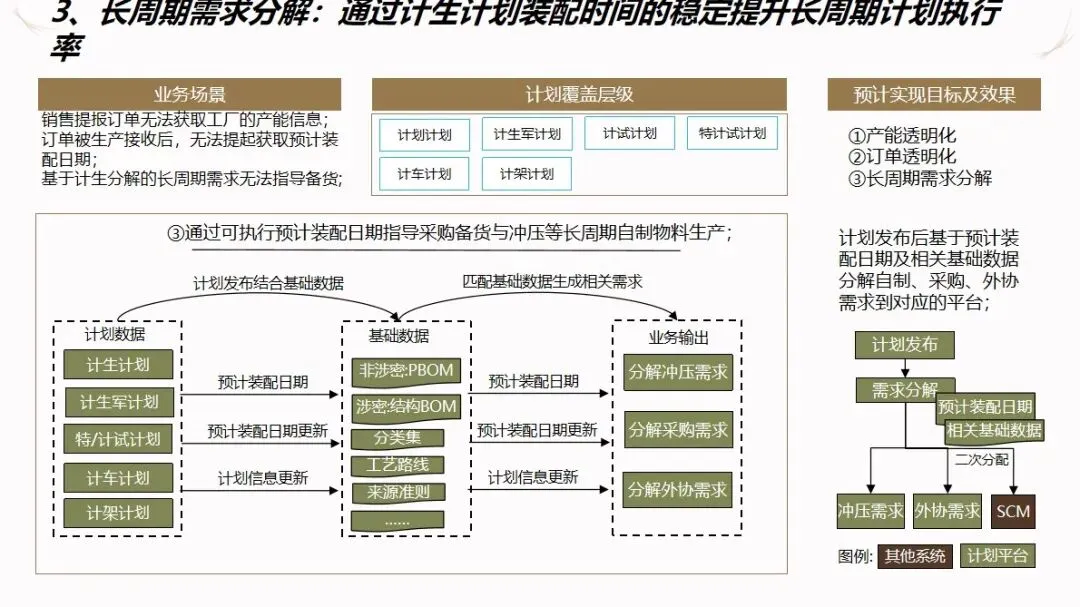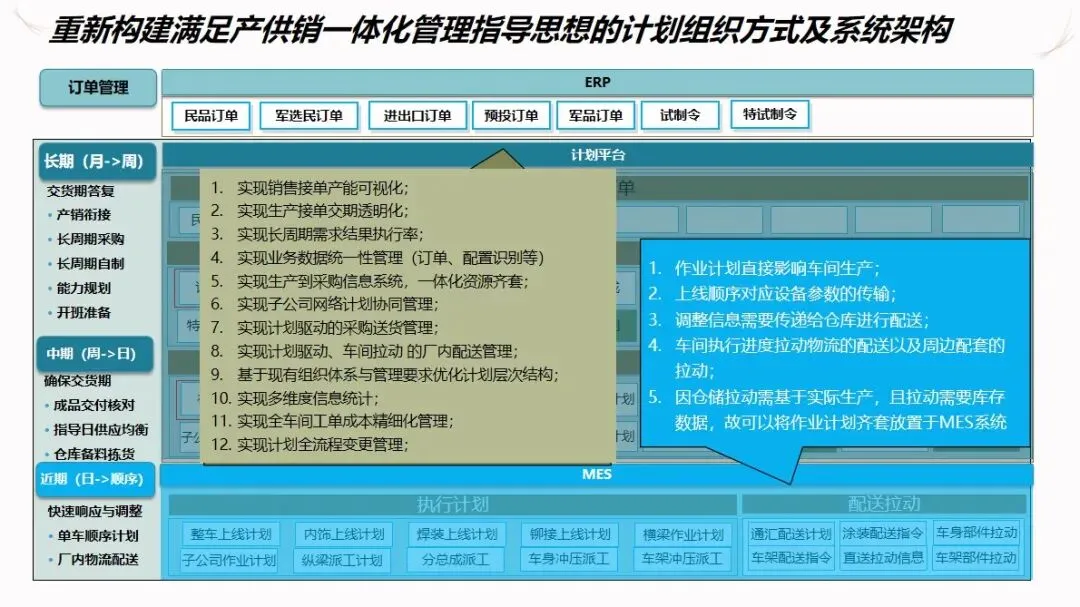方案的核心模块是计划驱动和供应链协作。针对目前计划和采购之间联系薄弱,订单传递缺乏透明度的现状,建立了“长月—周、中周—日、近日—序列”的三级计划系统,使企业的生产能力可视化,接单传递透明化。通过该系统自动执行长周期的需求分解,资源对齐检查,子公司的计划协调,以及根据组装计划调度的结果对采购发货和工厂配送进行优化,从而实现了从接收订单到制造发货的整个过程的协调。为了保证 ERP的财务管理效率,提高用户的操作体验和系统的可扩展性,建议使用独立的技术进行部署。