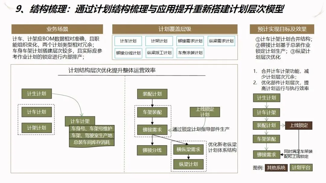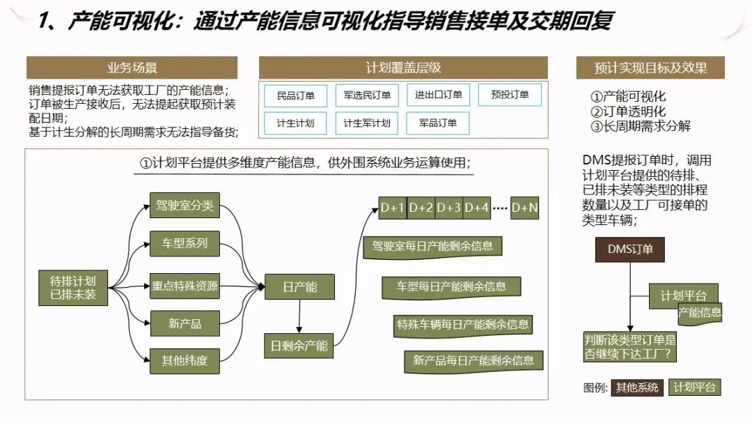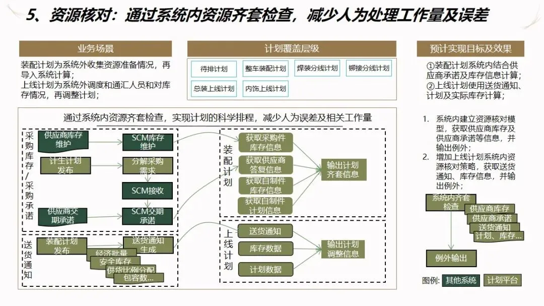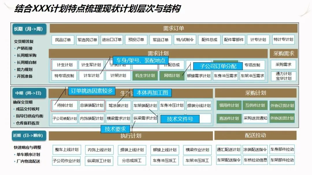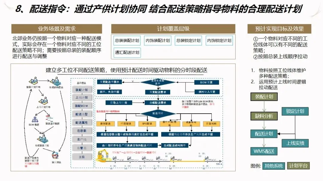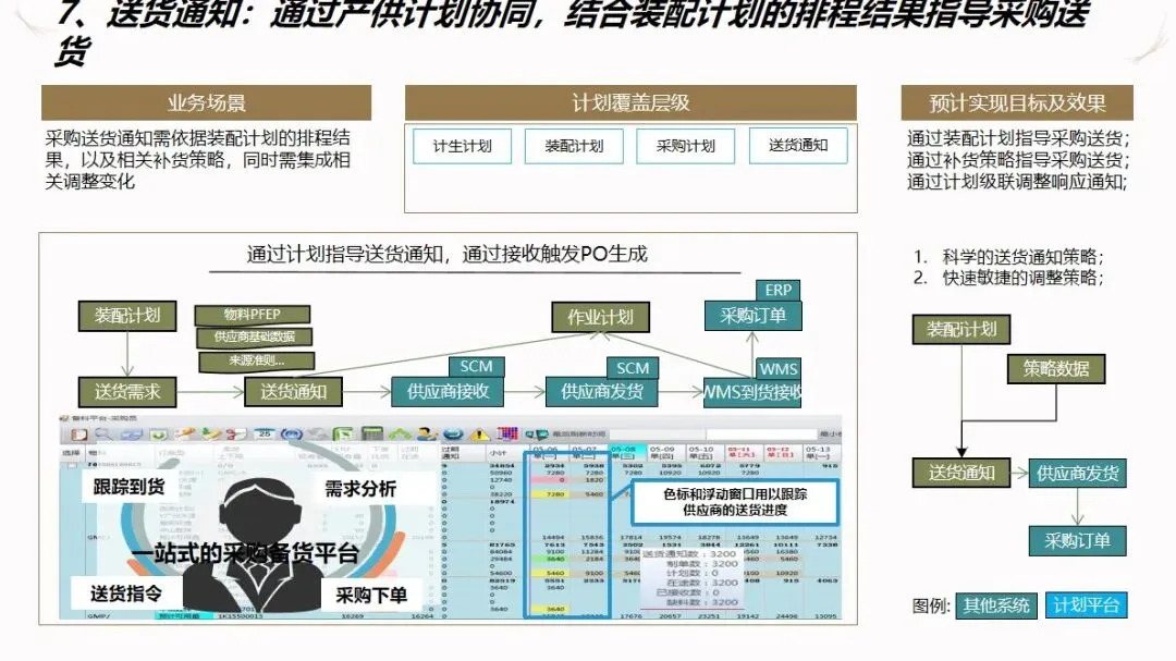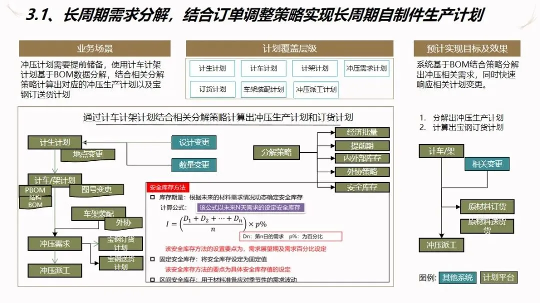 方案的核心模块是计划驱动和供应链协作。针对目前计划和采购之间联系薄弱,订单传递缺乏透明度的现状,建立了“长月—周、中周—日、近日—序列”的三级计划系统,使企业的生产能力可视化,接单传递透明化。通过该系统自动执行长周期的需求分解,资源对齐检查,子公司的计划协调,以及根据组装计划调度的结果对采购发货和工厂配送进行优化,从而实现了从接收订单到制造发货的整个过程的协调。为了保证 ERP的财务管理效率,提高用户的操作体验和系统的可扩展性,建议使用独立的技术进行部署。