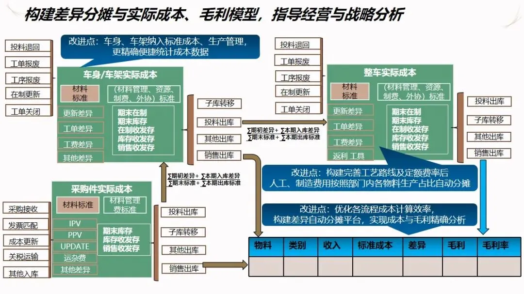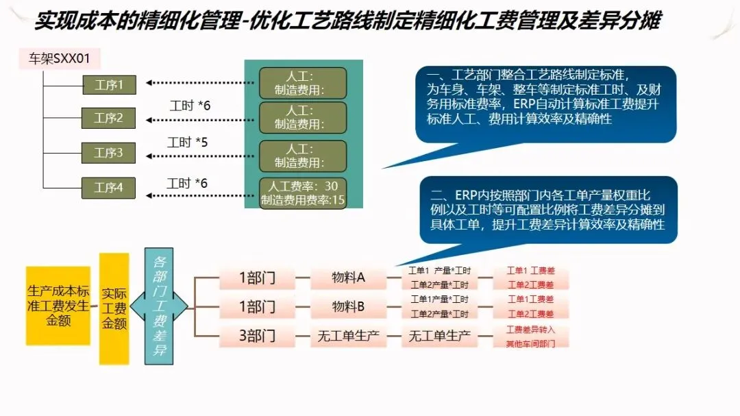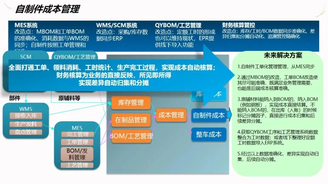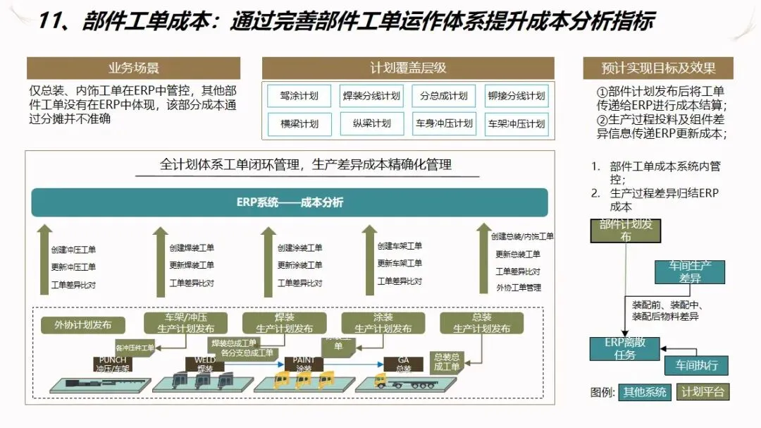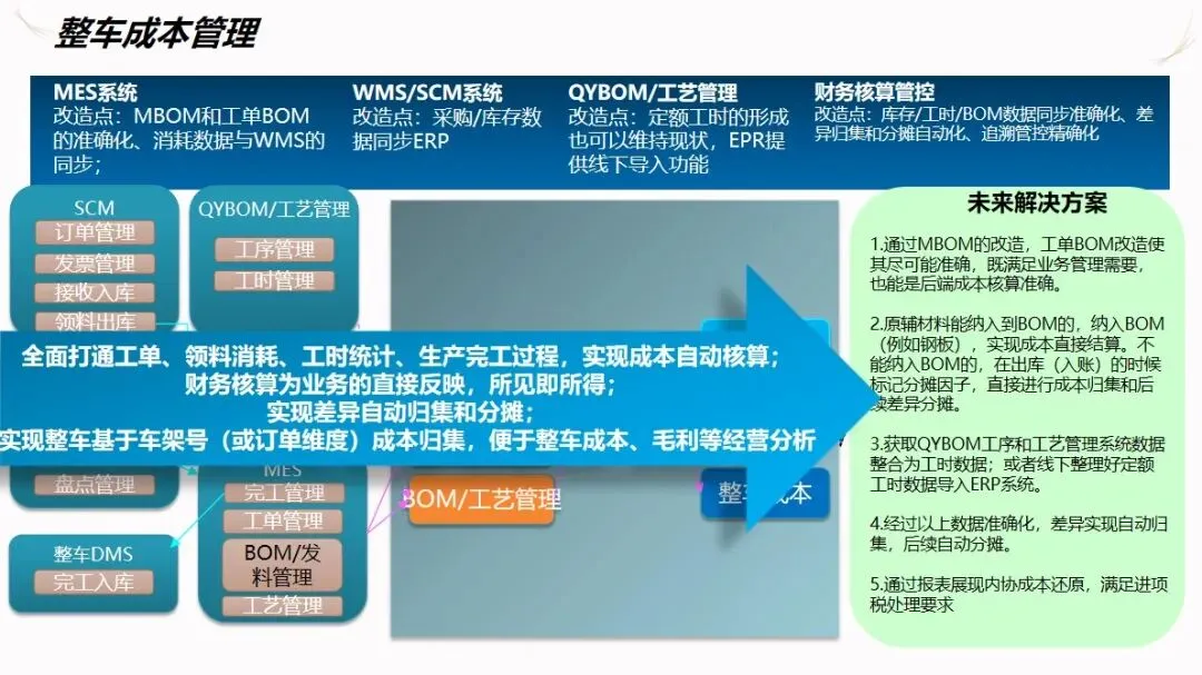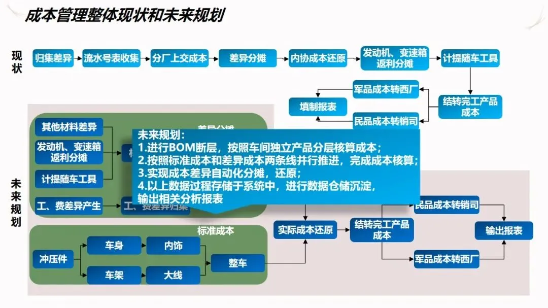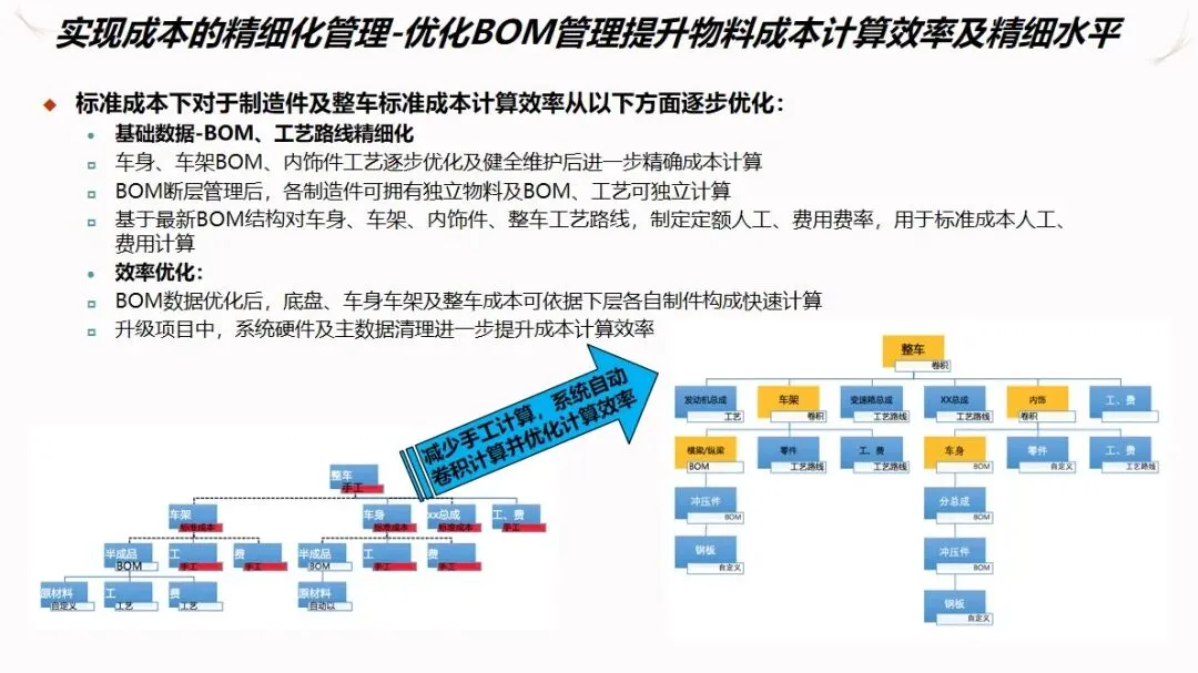 成本管理采用标准成本+差异分配/削减的成本管理模式,对 BOM和工艺流程进行优化管理,实现了从采购、自产到整车的全过程成本管理。系统能自动收集材料、人工等成本差异,并分层进行成本分摊,为企业提供成本比较、毛利分析等报告,为企业提供决策支持。通过 MES和 ERP的数据同步,使制造订单的成本能够自动计算,并将零件订单的成本纳入到系统的控制之中,从而提高了成本计算的准确性。