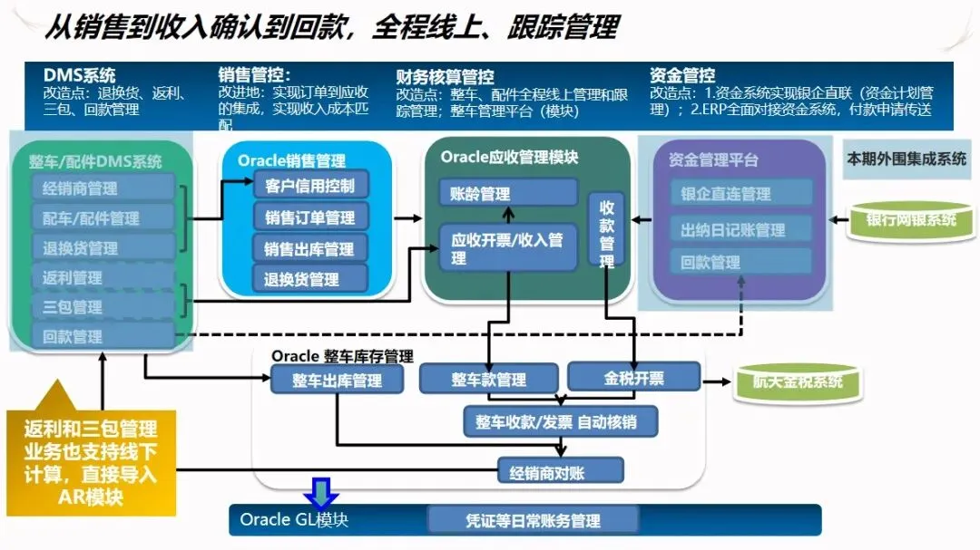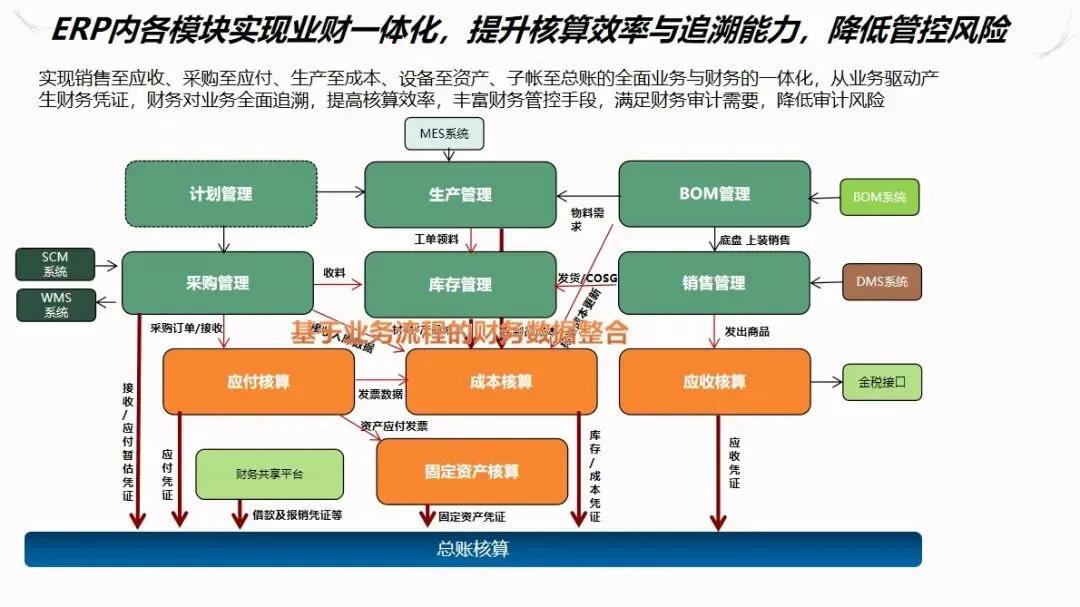 业务与财务的整合贯穿于项目的整个过程,贯通了销售与应收账款、采购与应付账款、生产与成本、装备与资产等业务环节。以业务数据为驱动,自动生成财务凭证,使财务人员可对业务的运行轨迹进行跟踪,从而减少了审计的风险。将财务共享平台和金税系统接口整合起来,实现了整车和配件从入库、开票到收款的全流程在线管理,将固定资产的购置、入帐、折旧和报废等全过程纳入了系统管理。