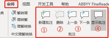 在【审阅】选项卡【批注】工具组中,我们可以完成以下操作: