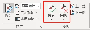 而且,在【更改】工具组中,我们可以选择接受或拒绝修订建议。单击【接受】/【拒绝】的下拉三角按钮,做了选择以后,修订的痕迹就会消失。