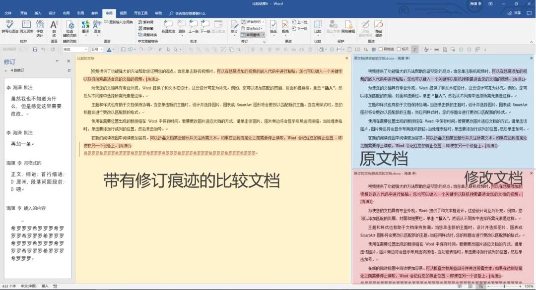 ▍Step3:比对结果会生成一份新的文档。左侧修订窗格显示了修改痕迹,中间是带有修订痕迹的计较文档,右侧上面是原文档,下面是修订文档。