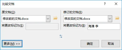 ▍Step2:在打开的【比较文档】的对话框中,按照提示分别打开修改前的原文档和修改后的修订文档,单击【确定】进行比对。