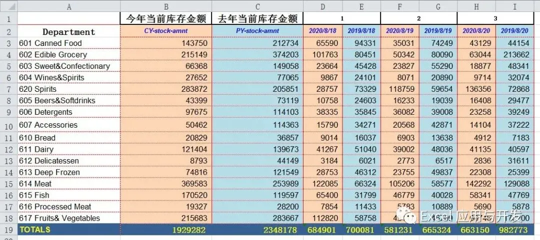 在这份报表里我们可以事先将当月所有去年的数据都填进去,然后每天将新产生的当天数据贴进当天对应的列中。我们在报表的前面做了今年和去年库存金额的汇总。