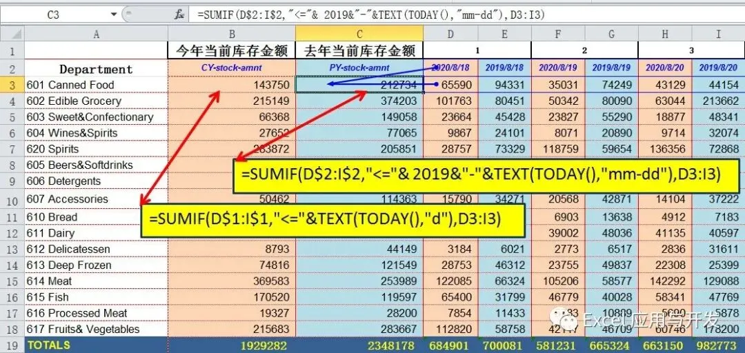 去年库存金额累计:=SUMIF(D$2:I$2,"<="& 2019&"-"&TEXT(TODAY(),"mm-dd"),D3:I3)
