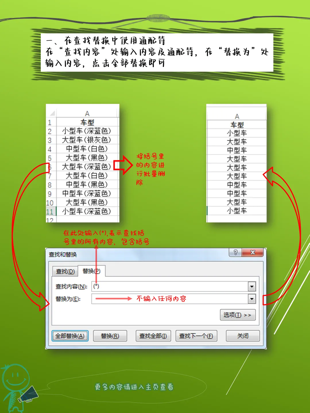 在“查找内容”处输入内容及通配符,在“替换为”处输入内容,点击全部替换即可。