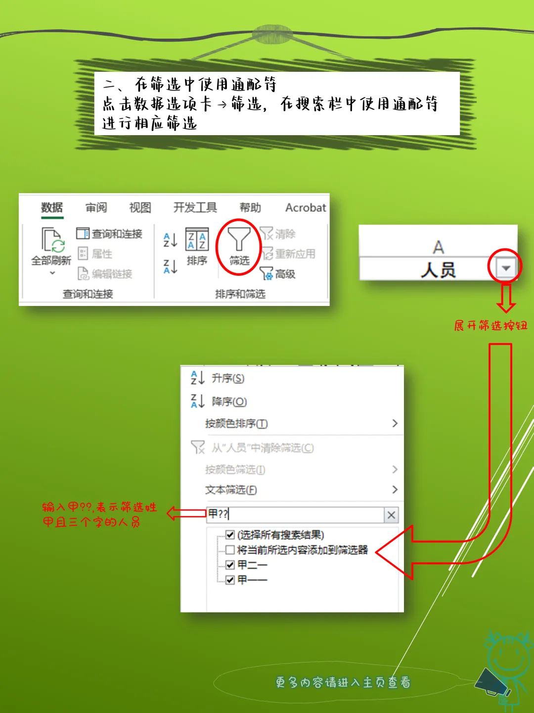 点击数据选项卡→筛选,在搜索栏中使用通配符进行相应筛选。