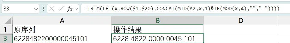 =TRIM(LET(x,ROW($1:$20),CONCAT(MID(A2,x,1)&IF(MOD(x,4),""," "))))以下是百度文心一言对这个公式的解释(懒得打字,AI生成的容有部分调整):ROW($1:$20)