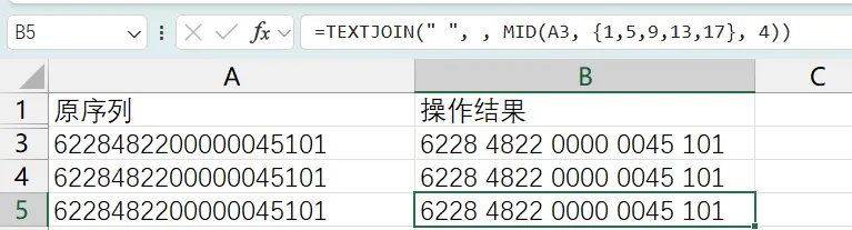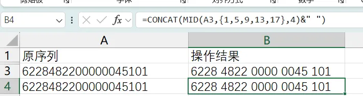 =CONCAT(MID(A3,{1,5,9,13,17},4)&" ")=TEXTJOIN(" ", , MID(A3, {1,5,9,13,17}, 4))这两个公式的核心逻辑都是用MID函数,用常量数组从指定的位置,依次取4个字符串。然后通过字符串连接函数CONCAT或TEXTJOIN函数生成。