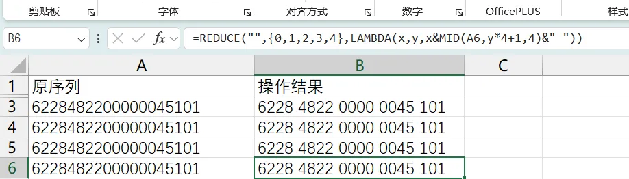 2. LAMBDA 函数:LAMBDA(x, y, x & MID(A6, y*4+1, 4) & " ")