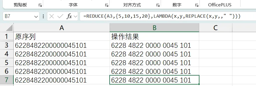 我们依照这个思路,再结合REDUCE函数进行循环操作,在指定位置加上空格,就可以实现了。=REDUCE(A3,{5,10,15,20},LAMBDA(x,y,REPLACE(x,y,," ")))